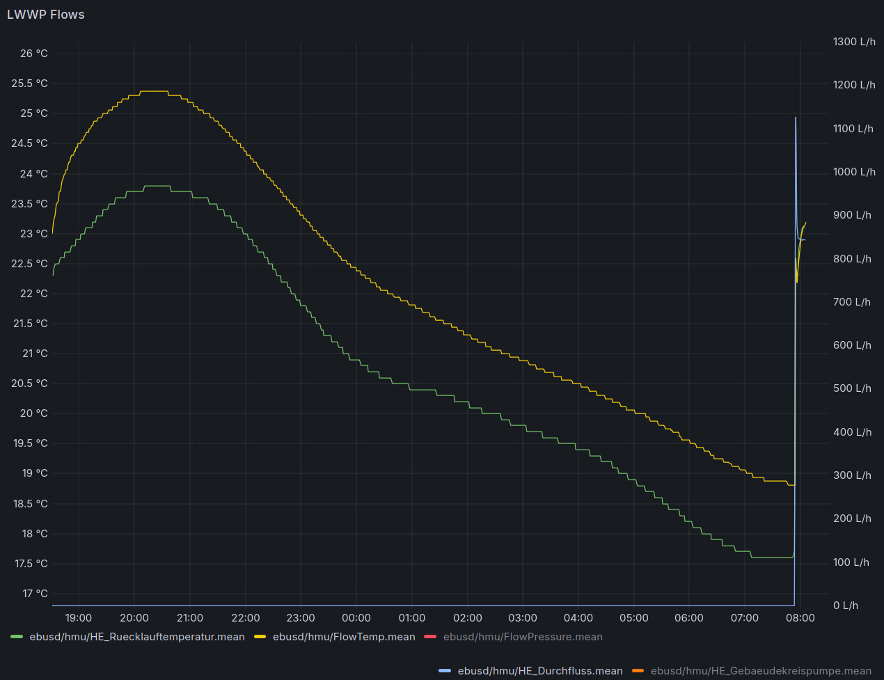 Hier nochmal ein Ausschnitt der beiden Sensoren wenn über die Nacht, wo die Pumpe nicht lief (am Ende habe ich die Pumpe eingeschaltet):