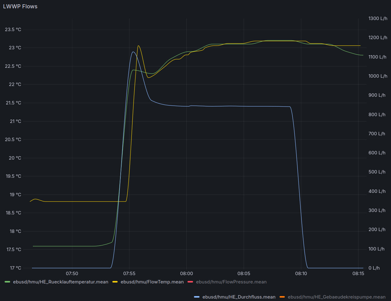 In der Grafik kann man ganz gut sehen, wie sich die Sensoren in dem Moment angleichen wo die Wasserpumpe anspringt.