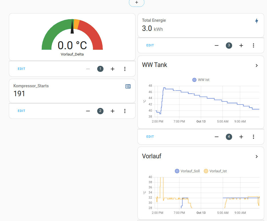 Ein kleiner Nachteil der rein softwarebasierten Lösung ist, dass sie etwas verzögert reagiert. Bei der Vorlauftemperatur geht das in ein paar Sekunden, bei den Verbrauchswerten eher im Stundentakt. Aber dafür muss man eben nicht an die Heizungsverkabelung ran. Schön wäre noch, wenn man ans Energieintegral selbst rankommen würde oder die aktuelle elektrische Leistung. Erste Versuche selbst ein Energieintegral zu berechnen waren nicht erfolgreich, scheinbar ist die Funktion zum Integrieren von mir nicht richtig konfiguriert, außerdem ist das Resetten eines Helpers knifflig.