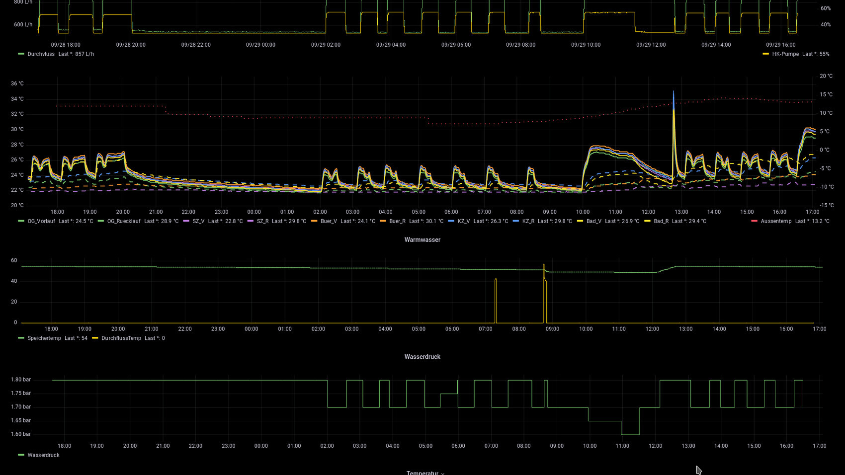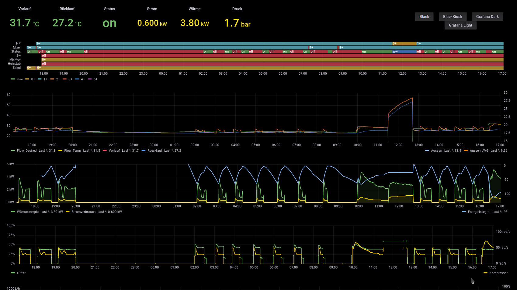 Ich habe in den letzten Tagen einiges an Statistiken eingesammelt und mir ein Grafana Dashboard gebastelt. Damit lassen sich sehr gut die Live-Daten einsehen. Ich frage die Werte aktuelle aller 60 Sekunden über ebus ab. Hier mal ein paar Bilder.