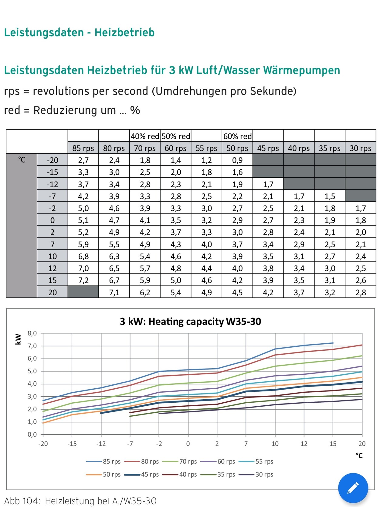 Daten und Grafik zur 5 kW Luft/Wasser-Wärmepumpe: Tabelle mit rps/Reduktion und Heizkurve W35-30.