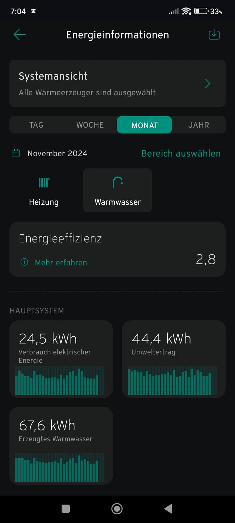 Warmwasser mache ich jeden Tag um 13.00 auf 56 Grad im Eco Modus.Deine Arbeitszahl von 2,9 bei 56 Grad Warmwasser-Temperatur ist sehr gut. Ich erreiche nur 2,8 bei 42 Grad, auch nachmittags im Eco-Modus.Bin damit aber trotzdem zufrieden, weil ich weniger als 1kwh/Tag für das WW verbrauche.