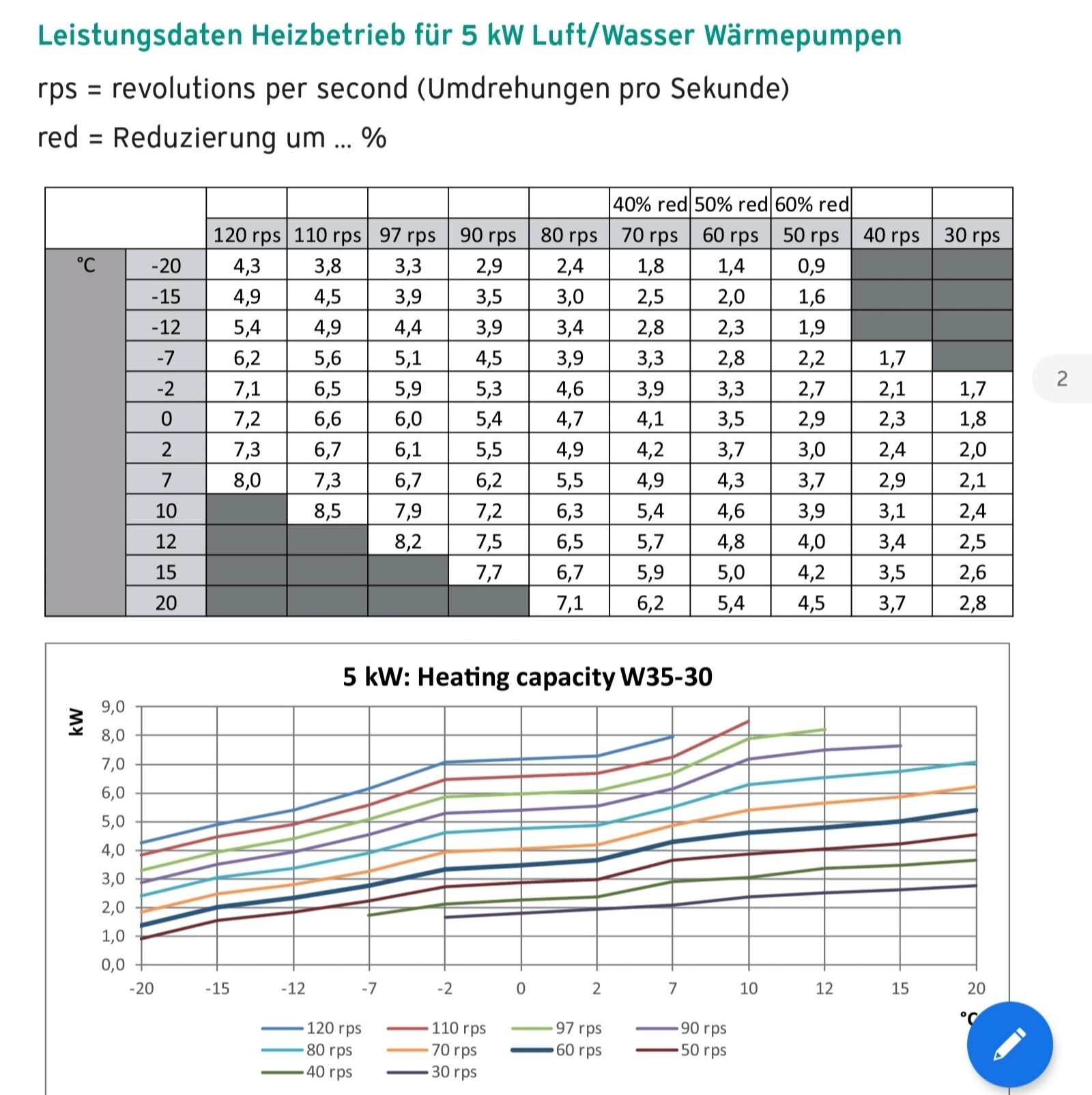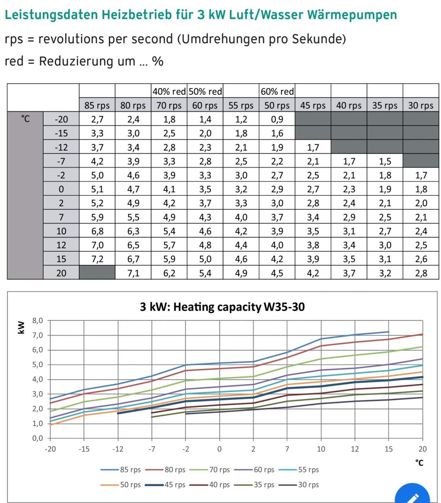 Du kannst die Leistungswerte einer 35er nicht mit der 55er oder 75er vergleichen. Eine 35er im Flüstermodus mit -40%/60% läuft mit deutlich geringerer Kompressordrehzahl. Toll, wenn man mit der homöopathischen Leistung auskommt. Wobei sich mir nie wirklich die Daseinsberechtigung ggü. einer 55er erschlossen hat. Sie ist nach oben beschnitten, kann aber m.E. im Schwachlastbereich nicht weniger Leistung abgeben als eine 55er, d.h. sie taktet dann auch nicht weniger.Die 35/6 und 55/6 unterscheiden sich bezüglich der Kompressordrehzahl im unteren Bereich (Leistung) nicht voneinander. Beide Maschinen laufen im Flüstermodus identisch. Nur nach oben gibt es Unterschiede. Die kleine bringt max 85rps und die größere 55 bringt max 120 rps.