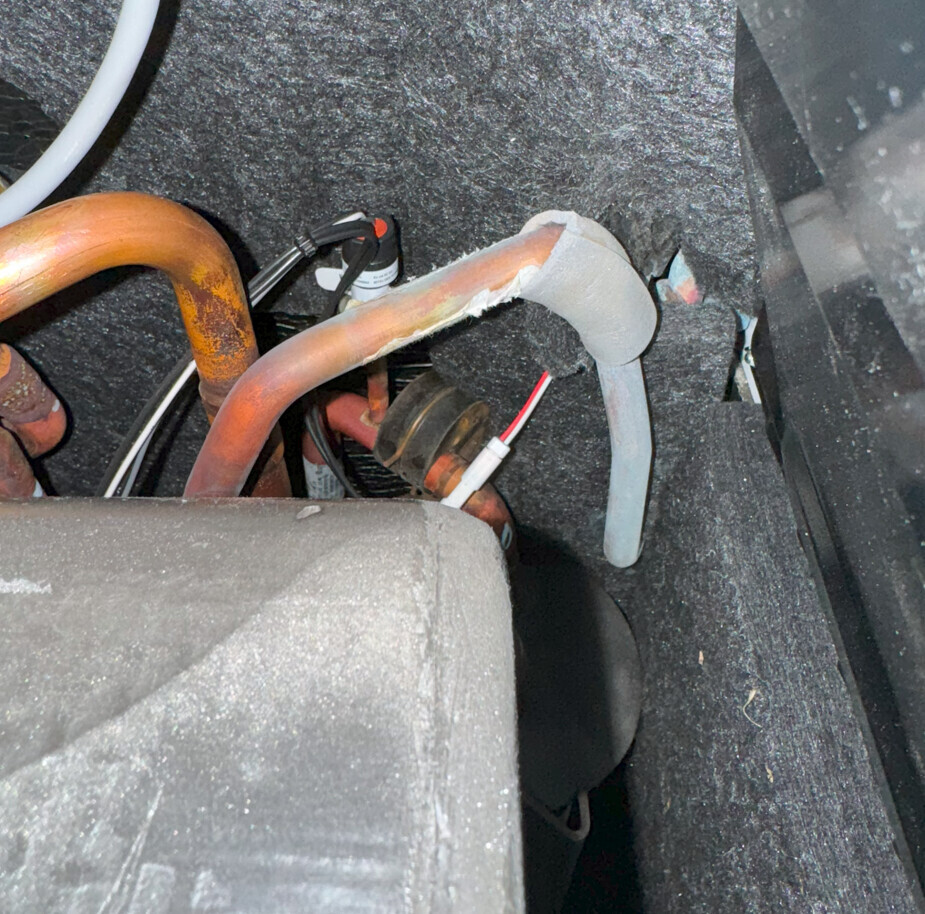 Wenn ich den runden Puffer wieder so drehe, dass er auf der Dämmmatte aufliegt, dann habe ich 2-3mm Luft zwischen Kältekreis und Gehäuse und alles ist wieder leise.
