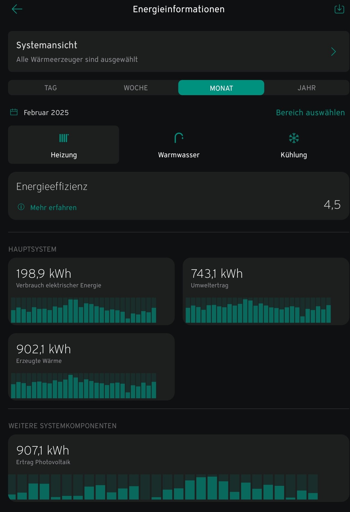 Durch AT: 1,6°CMeine Daten weiter oben sind ja nur Heizen. Da wäre bei dir die AZ auch bei 4,3 oder 4,4. Somit recht gute Werte.