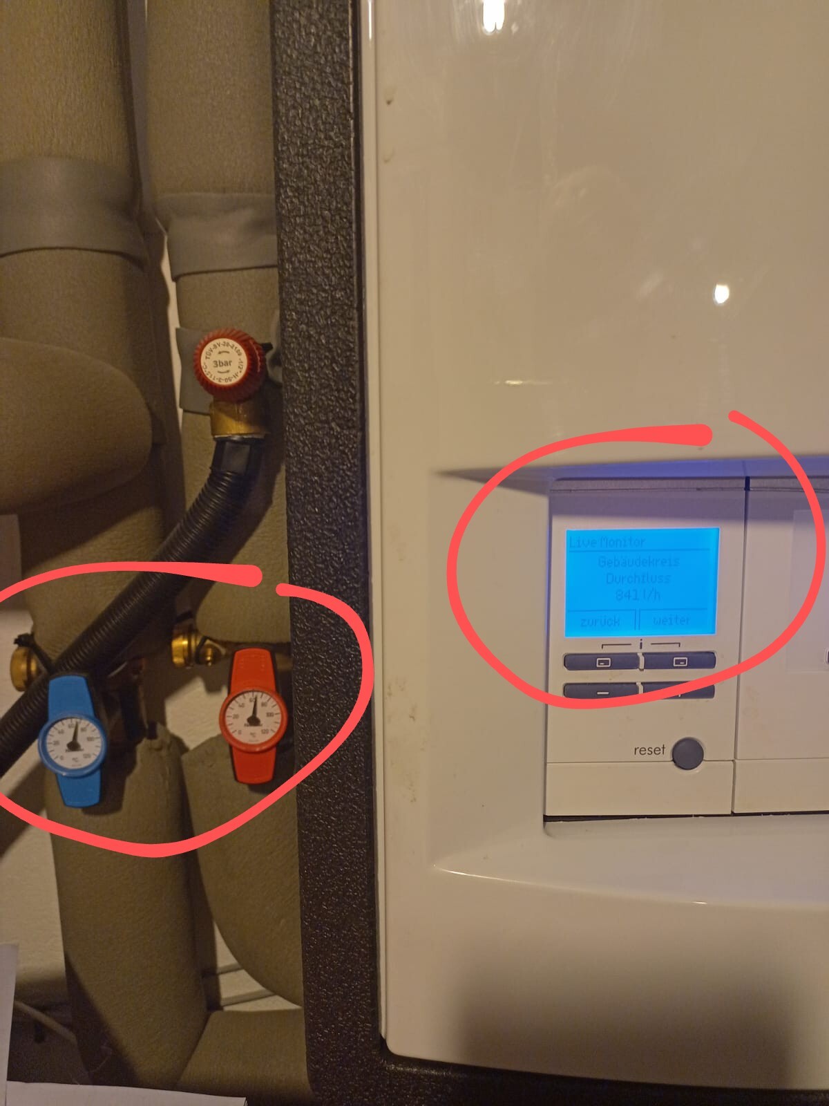 Anbei Bilder vom Gebäudekreis ( fast 70°C), den Einstellungen zum Heizstab, und Live Monitor nach einer Stunde