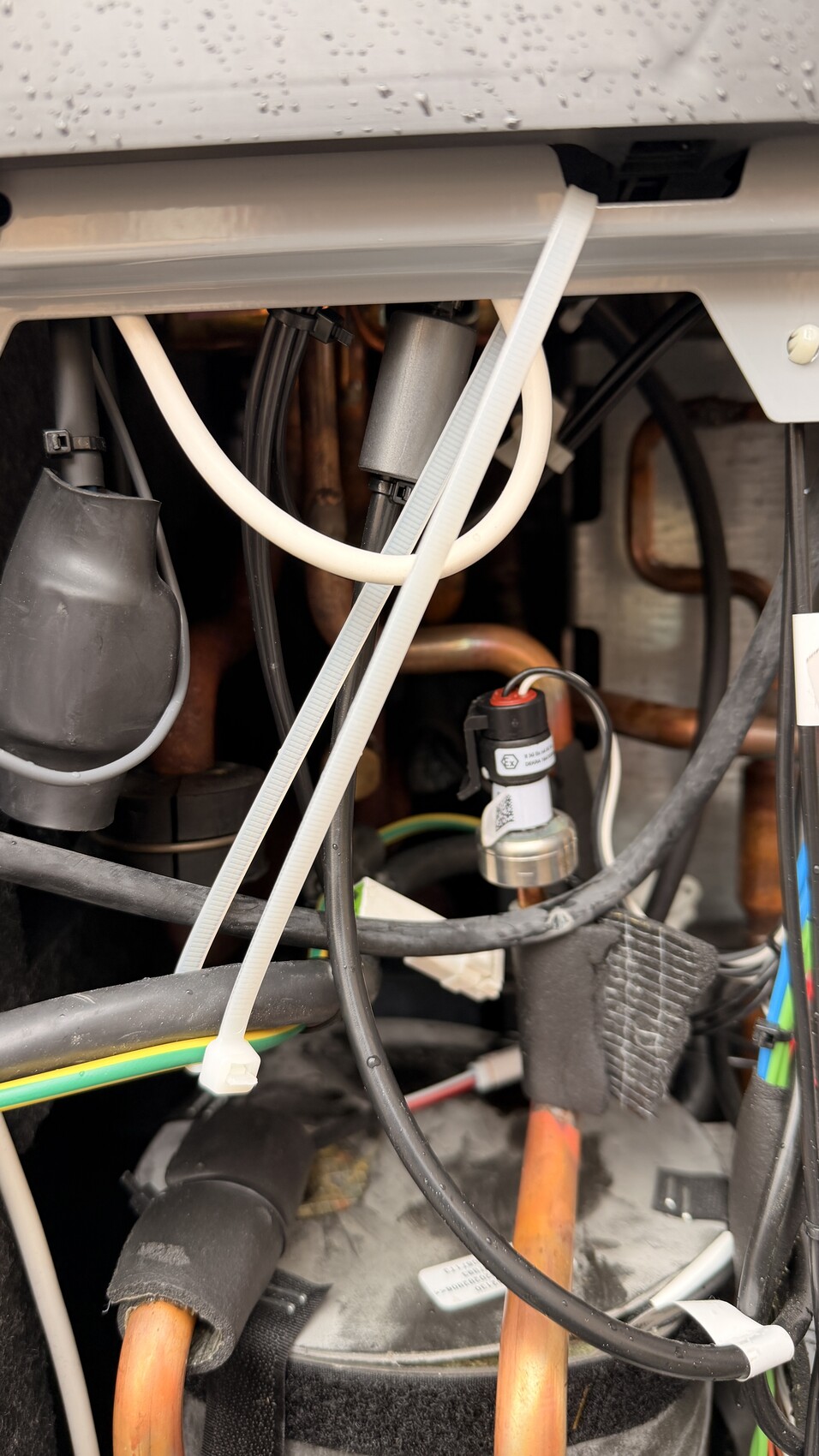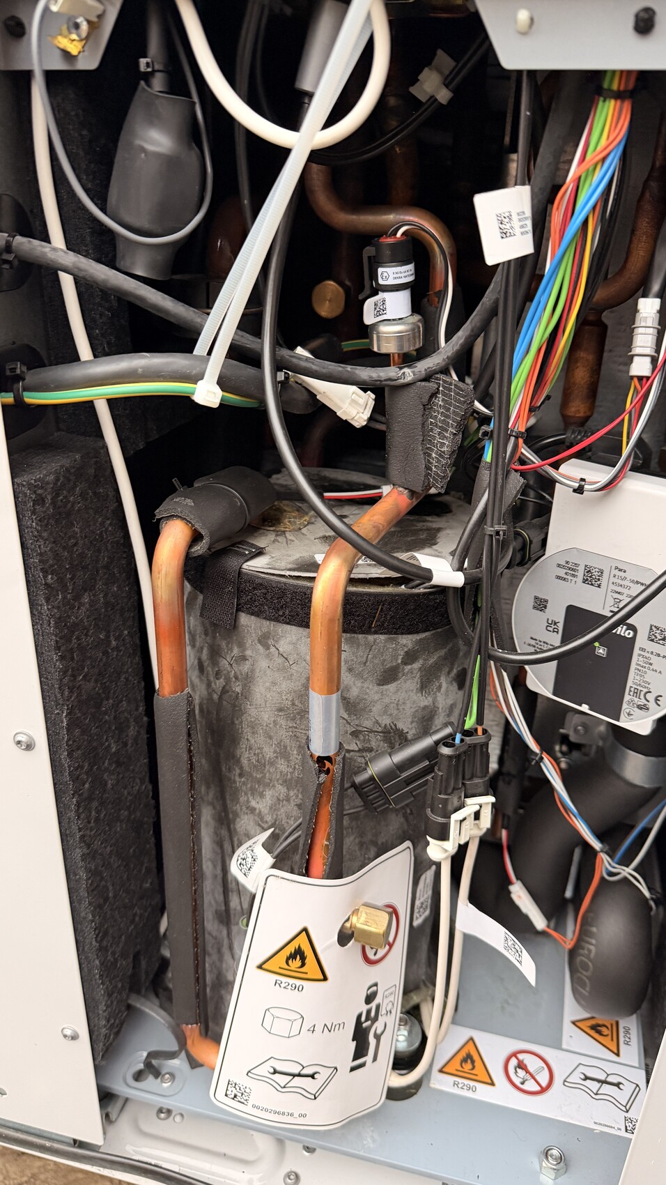 Also aufgeschraubt, der Kältemittelsammler war nicht besonders vereist. Die Lösung war das Stromversorgungskabel des Kompressors, das bei meiner Wärmepumpe aus relativ hartem Gummi ist. Das Kabel war um den Kompressor verlegt, was das Brummen verursacht hat. Zusätzlich habe ich die Isolierung des Kompressors von der Bodenplatte entkoppelt. Die Isolierung ist aus relativ hartem Kunststoff, gefühlt hat das auch etwas gebracht. (siehe Bilder)