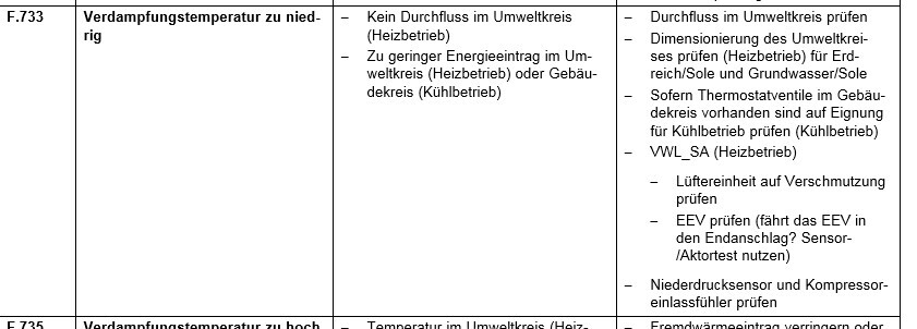 Fehler F.733 Verdampfungstemperatur zu niedrig. Dieser Fehler wurde wohl gestern "behoben" oder nur gecleared!? Die Luft-Wasser-Wärmepumpe zeigt zwar kein Fehlercode mehr an, jedoch auf dem LiveMonitoring ähnliche Status Fehler.