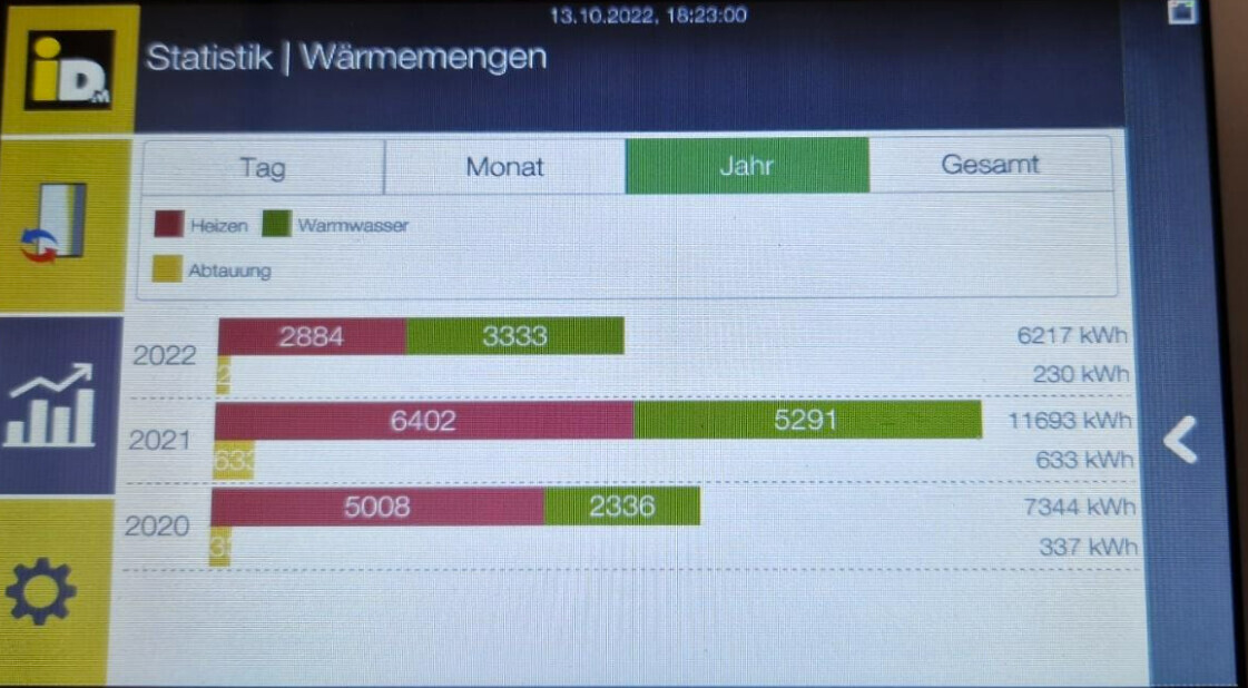 Jahresstatistik der Wärmemengen: rote Heizen-, grüne Warmwasser- und gelbe Abtauung-Balken mit kWh.