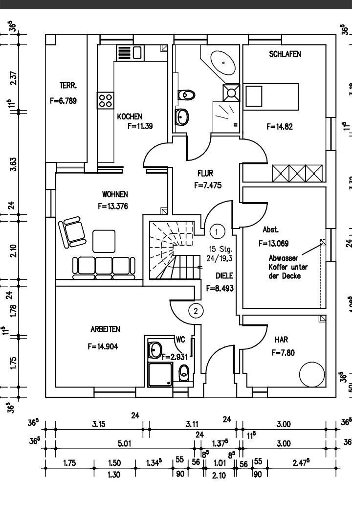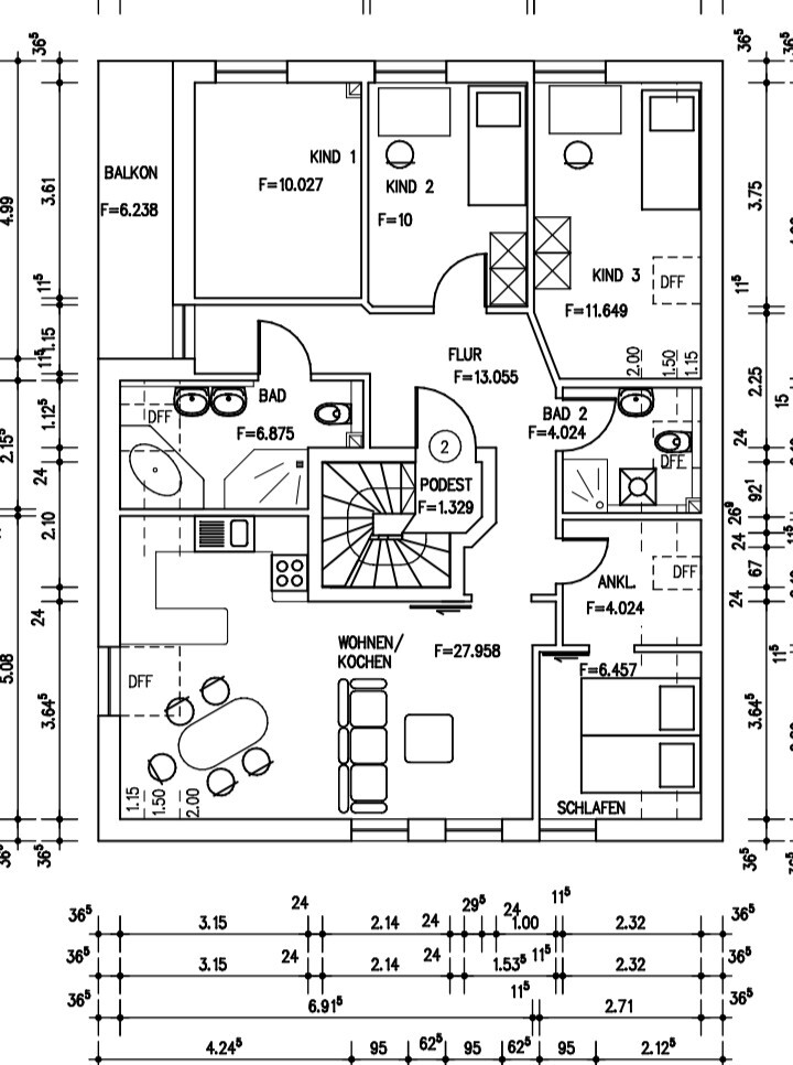 PS. bei deinem Grundriss fehlt eine Treppe und viele Räume haben keine Türen.