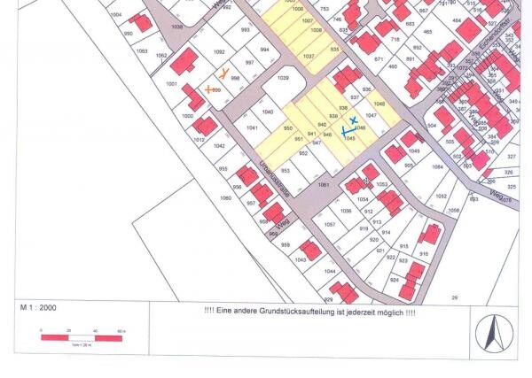Angeboten wurden uns von der Gemeinde die Grundstücke 1045 und 1046 (mit blauem Kreuz in der Anlage markiert) mit einer Gesamtfläche von 698 qm. Nun sind zwei weitere Grundstücke - auf der beigefügten Anlage die Nummern 998 und 999 (orange Kreuze) mit in der Verlosung. Gesamtfläche 775 qm.