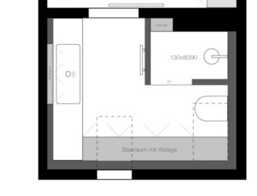 Das funktioniert nicht wirklich. Die Kopffreiheit am WC sowie beim Eingang zur Dusche ist sehr eingeschränkt.Der erste Vorschlag wird wohl funktionieren.