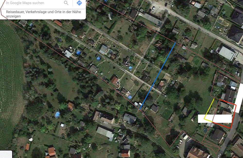 Gelb ist der Pachtgarten, den er aktuell von mir pachtet und nun eventuell kaufen will.