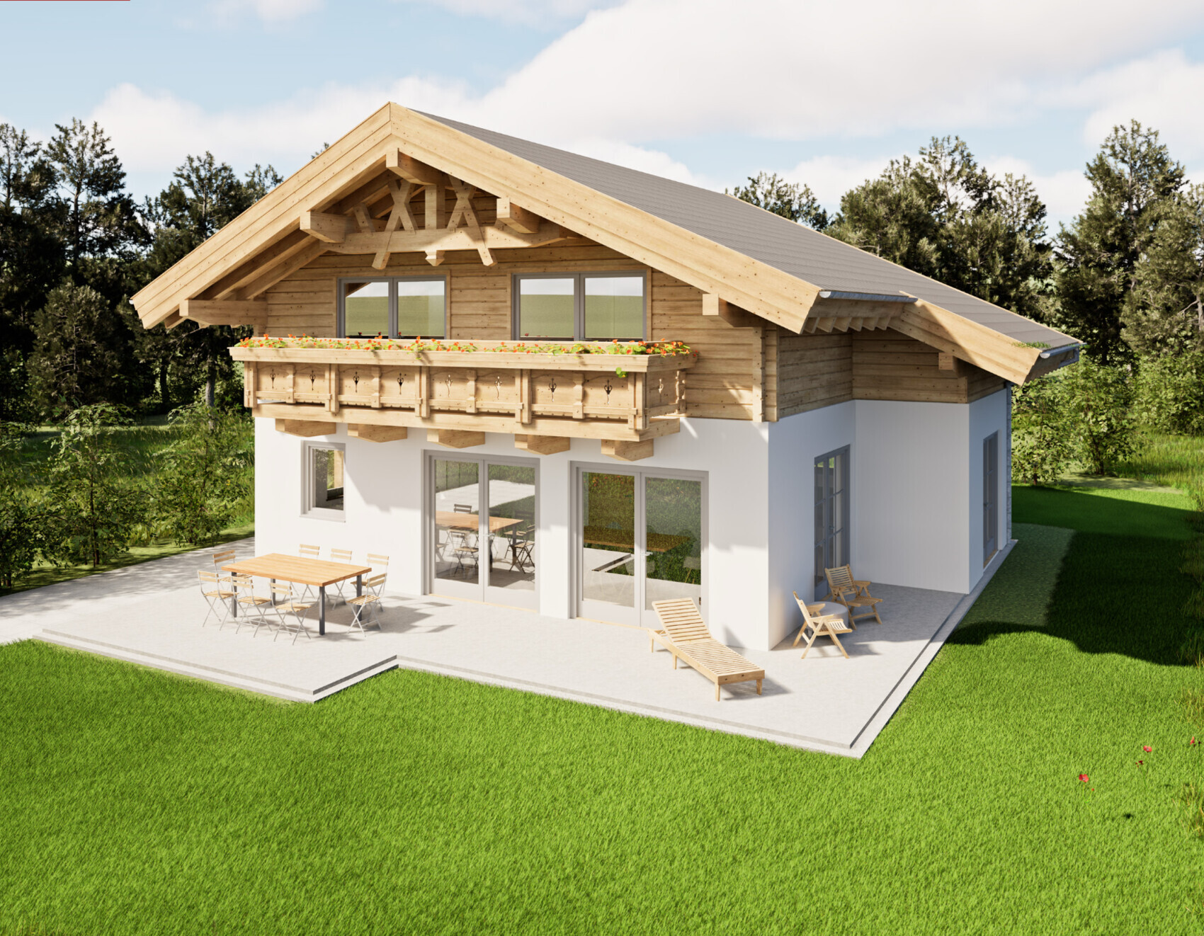 ihr wollt ein Haus im Alpenchalet Stil. Warum baut ihr dann nicht so? Unten Stein massiv und oben Holz massiv?