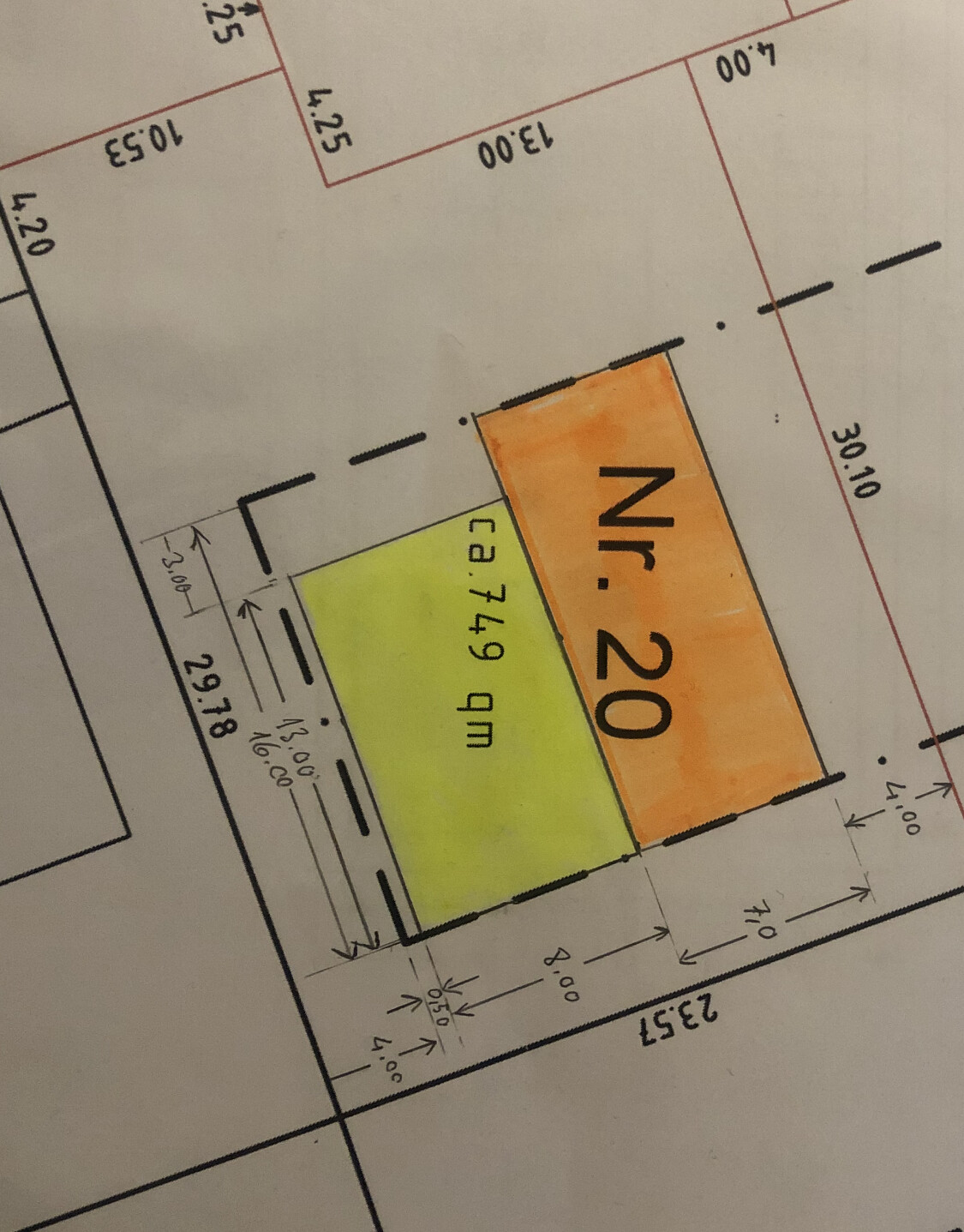 Ich hab mal Deine Maße genommen und die Variante mit 20 Grad gezeichnet. Zum Verständnis: zwischen den beiden Wohneinheiten im Knick dürfen natürlich innerhalb der 3 Meter keine Fenster liegen.