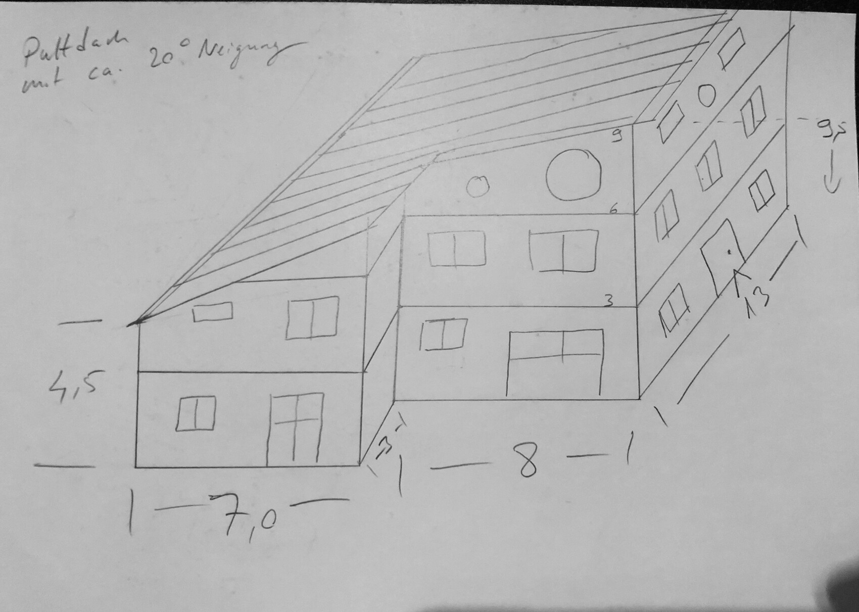 Allerdings ein Pultdach durchgehend von li. nach re. (norden nach Süden) gezogen mit ca. 20° Neigung, also kein Pultdach mit zwei Teilen sich versetzt kreuzen. Habe lange gegoogelt und konnte nichts Ähnliches finden.