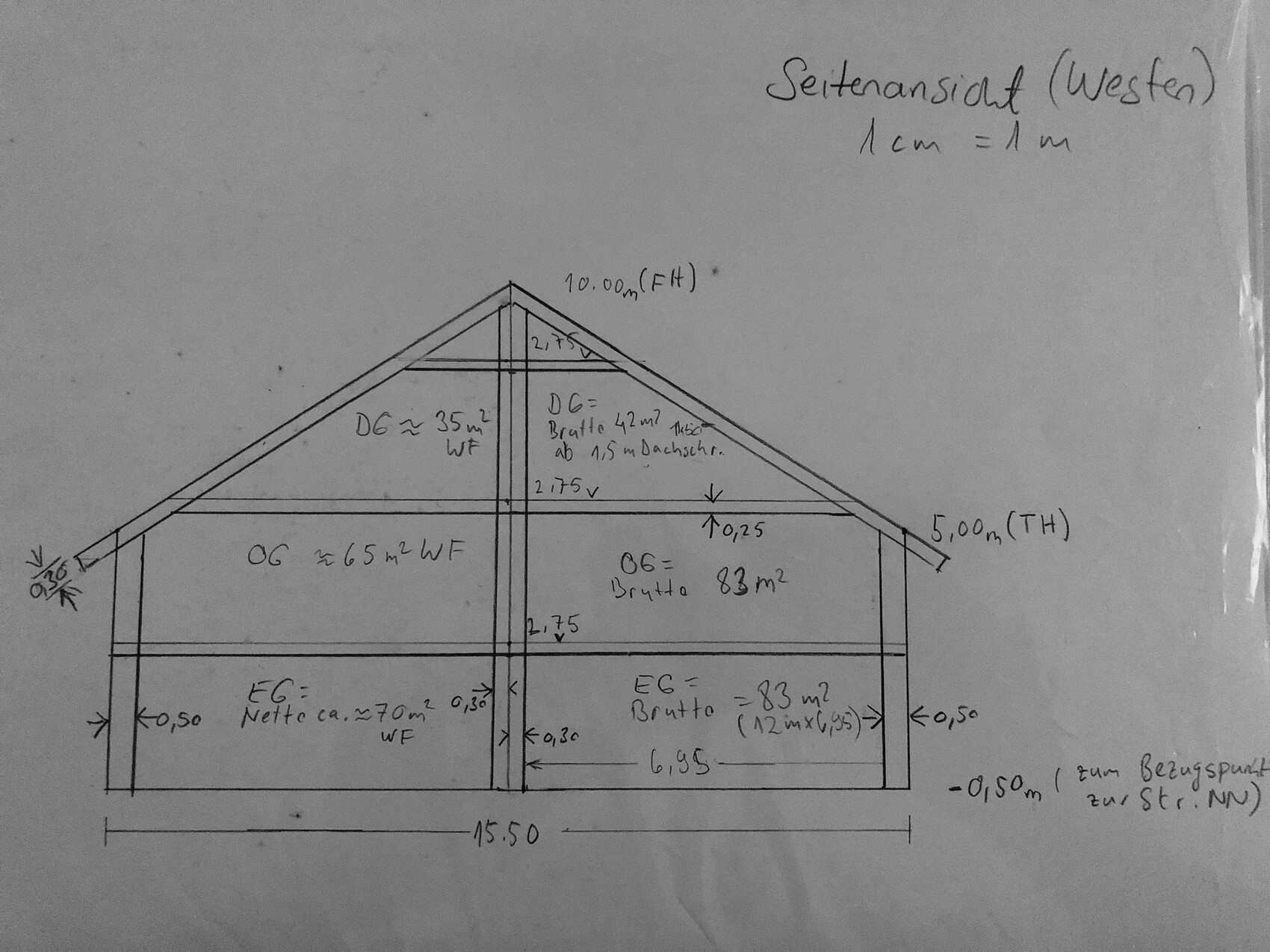 Ich werde ein Haus mit einem Satteldach bauen auf einer Grundfläche von 15,50 × 13 m, es soll ein Doppelhaus/Zweifamilienhaus/Einzelhaus, wie es immer heißt werden mit zwei Haupteingangstüren. Es sind zwei Vollgeschosse plus ein Dachgeschoss an jeder Hälfte und aus diesen „Hälften“ soll jeweils zwei Wohneinheiten entstehen die man später auf Bedarf zusammenlegen kann. Also aus einer Doppelhaushälfte sollen zwei Wohneinheiten werden, vielleicht später nur eine. In einem anderen Thread hier habe ich diesbezüglich eine Frage In den Raum geworfen, da ich nicht ganz sicher bin, ob es so durchgehen wird mit dem Bebauungsplan.