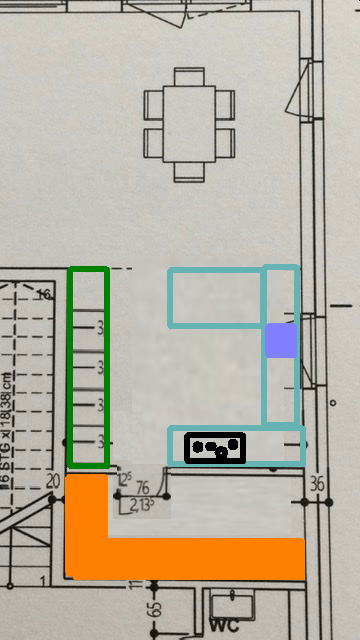 - grün = Hochschrankwand in Küche, evtl. 90 cm Unterschrank-Nische dazwischen für Kaffeeautomat oder Küchenmaschine