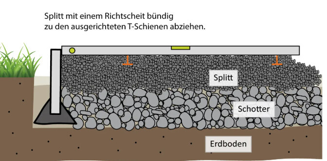 Querschnitt: Split-Schicht oben, Schotter darunter, Erdboden unten; Richtscheit richtet T-Schienen aus.