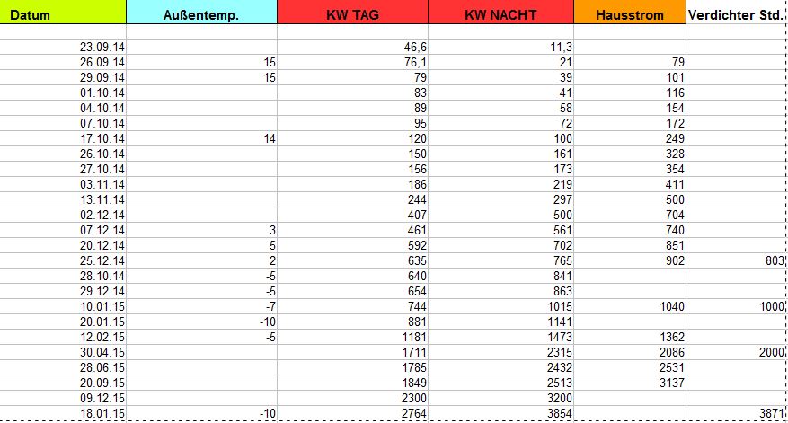 leider kann ich bei meiner Wärmepumpe nicht mitloggen- das muss ich alles manuell mitschreiben und vergesse es leider Die letzten 4 Tage habe ich pro Tag ca. 21 kw/h verbraucht.