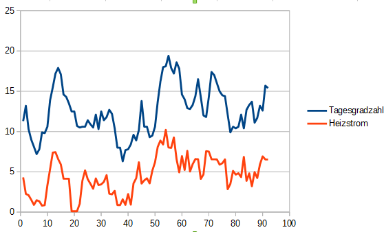 Hier mal zum Vergleich ein Beispiel von mir. Ich logge unter anderem auch den Verbrauch (nicht nur die Summe, sondern den Verlauf eines jeden Tages) der Wärmepumpe und die Temperatur mit, und lasse am Ende eines jeden Tages den Gesamtverbrauch und die Tagesgradzahl berechnen. Die Tagesgradzahl ist die durchschnittliche Temperaturdifferenz zwischen draußen und drinnen im Verlauf des ganzen Tages. Außen messe ich an einer Wind und Sonneneinstrahlung geschützten Stelle in Bodennähe (es könnte dort also im Winter tendenziell wärmer, im Sommer kälter sein als z.B. an der Hauswand in einiger Höhe), innen in einem Raum mit typischer Temperatur. Im Diagramm fehlen ganz unwissenschaftlich Achsenbezeichnungen etc: Die x-Achse sind die vergangenen Tage seit dem 1.10.2015, die Y-Achse kWh für den Stromverbrauch, °C für die Tagesgradzahl. In dem Stromverbrauch ist, wie bei dir, die Warmwasserbereitung mit integriert (im Prinzip ein kleiner Offset zur Kurve im Vergleich zum Heizbetrieb).