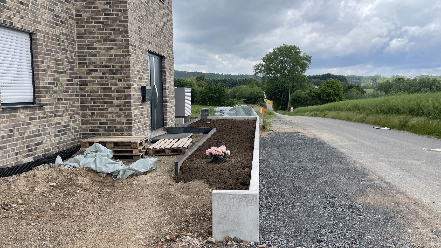Baustelle am Wohnhaus: Paletten, Abdeckplanen, neues Beet mit rosa Blüte, unbefestigte Zufahrt.