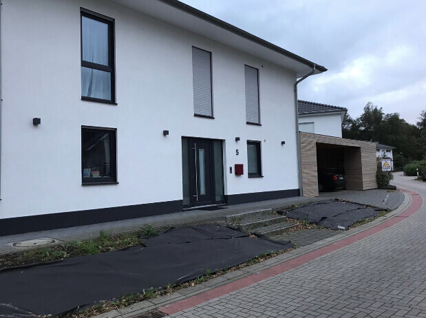 Ich habe mal ein paar Bilder hochgeladen, was ich so meine, welchen Stein wir uns ausgeguckt haben, ein Foto unseres Hauses, aktuell noch ohne nichts davor und eine Skizze, wie wir das so in etwas planen.