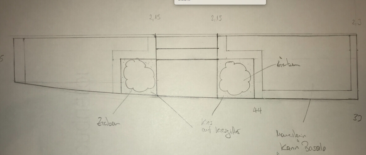Meine Frage: Hat hier im Forum jemand schon Erfahrung damit? Was ist Eure Meinung dazu, übersehen wir irgendwelche signifikanten Nachteile einer solchen Konstruktion? Die Mauer/Einfassung wird eine Höhe von 45-65cm haben, dies ist dem Gefälle der Straße vor unserem Haus geschuldet. Wir würden die Schalungsmauer mit einer entsprechenden Bewährung versehen, da sie mit Mutterboden hinterfüllt werden würde.