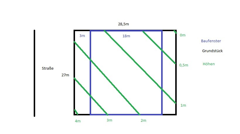 anbei findet ihr eine Skizze der Höhenlinien des Grundstücks. D.h. ich habe in der hinteren linken Ecke (von der Straße aus gesehen) den Nullpunkt gesetzt. Über die Diagonale steigt das Grundstück ca. 4m an. Wenn ich nun ein Haus mit 12m Länge darauf setze, ergibt sich auf die Länge (von Straße aus nach hinten abfallend) des Hauses ca. 1-1,5m Höhenunterschied, je nachdem wo das Haus angeordnet ist. Zwei Architekten sind bei den ersten Gesprächen schon direkt der Meinung gewesen, dass es sich hier anbietet, das Haus mit Keller zu bauen.
