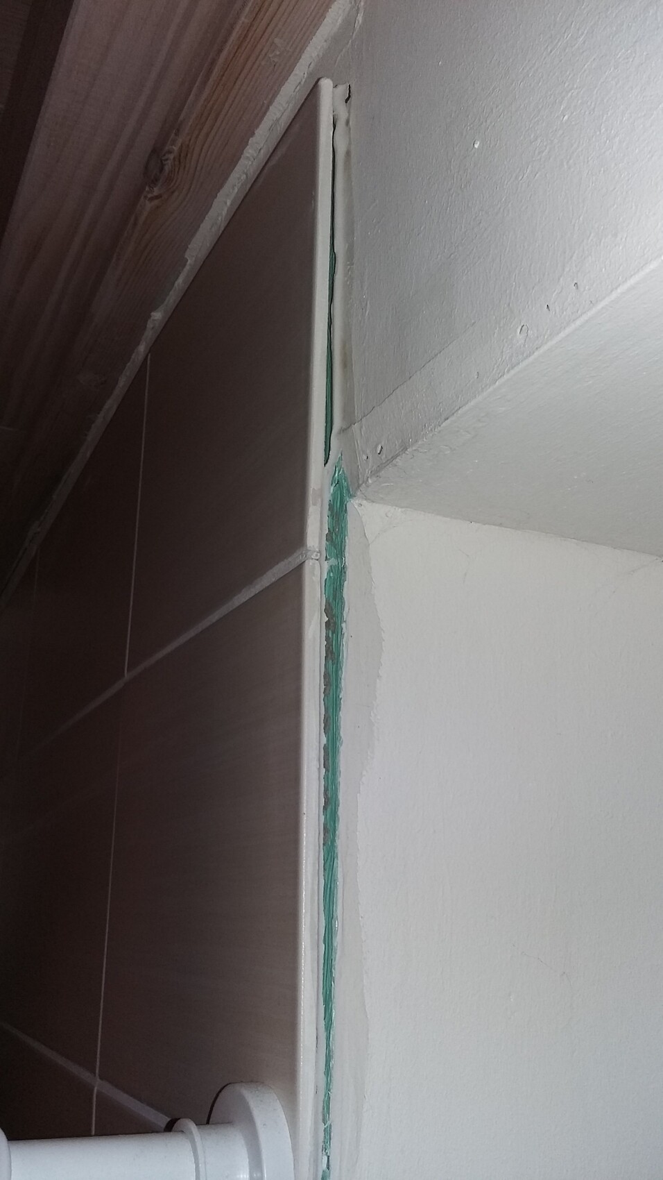 Seiner Meinung nach bekommt man das nie in den Griff, da die Holzkonstruktion dahinter zu sehr arbeiten würde. Was mich wunderte, da er sich das ja schon damals hätte denken können wenn es bekannt ist, das bei solchen Konstruktionen Probleme auftreten. Dann hätten man vielleicht gar nicht erst die Nasszelle gefliest. (Apropos Nasszelle, dass in einer Nasszelle eigentlich ja keine Feuchtraumgipskartonplatten reingehören sondern Platten auf Zementbasis weiß ich inzwischen auch).
