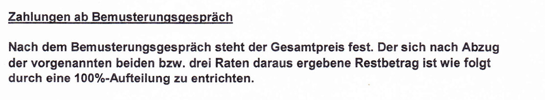 In unserem Fall war dadurch das Risiko bis zum Ende auf Seiten des BauträgersDa der Besitz erst mit der Abnahme übergeht und das Eigentum noch später, sehe ich eigentlich gar kein Risiko auf der Seite des Bauträgers. Zumindest nicht in der derzeitigen Konjunktur. Wenn ihr ausfallt (ausgefallen wäre), hätte er an den nächst-besten verkauft.Der Bauträger trägt natürlich grundsätzlich das Risiko des Bauherren, er sollte also seine Subunternehmer nicht vorschnell mit hohen Abschlägen beschenken, denn die könnten ja insolvent gehen .