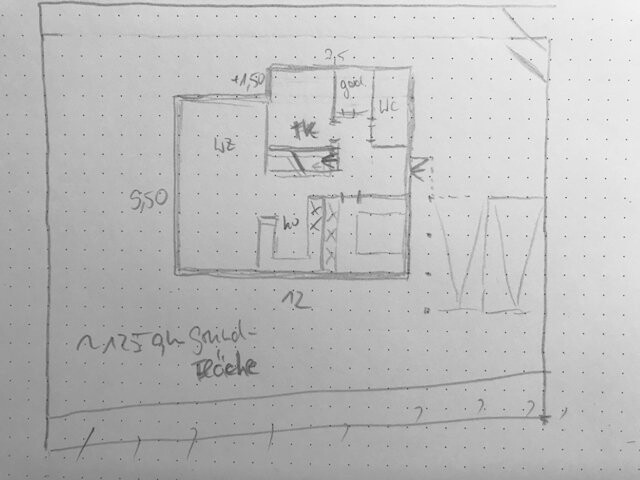 Mal skizziert... ich komme da auch eine Grundfläche von ca. 125qm... oben als Rechteck etwas weniger. So kommen wir auf eine Wohnfläche von 200 qm. Ohne Keller, dafür TK im EG, Hauswirtschaftsraum bim OG. 2000€ x 200qm