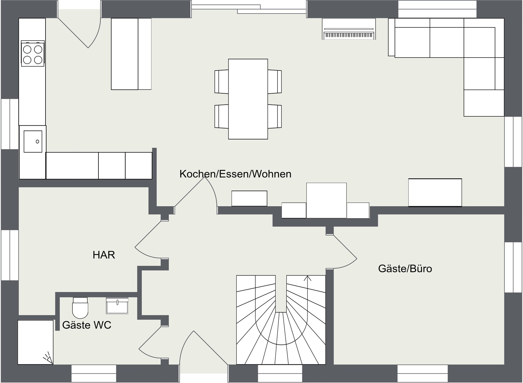 Grundriss eines offenen Kochen/Essen/Wohnen-Bereichs mit Esstisch in Mitte, Treppe unten.