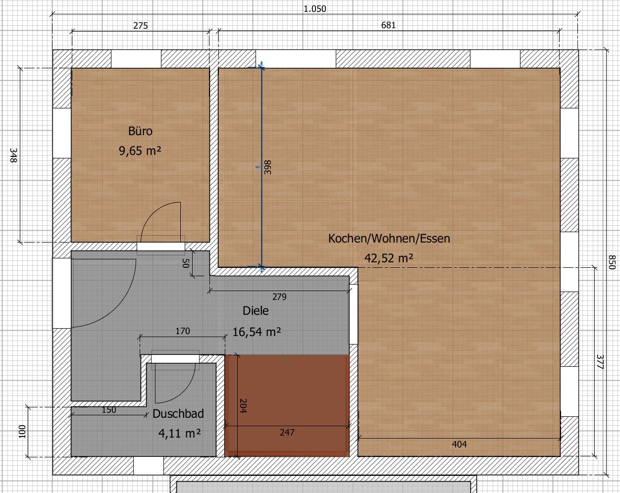 Im Anhang mal die gezeichnete Idee, die gestrichelten Linien sind nur gedankliche Raumtrenner, dort sollen keine Wände sein.