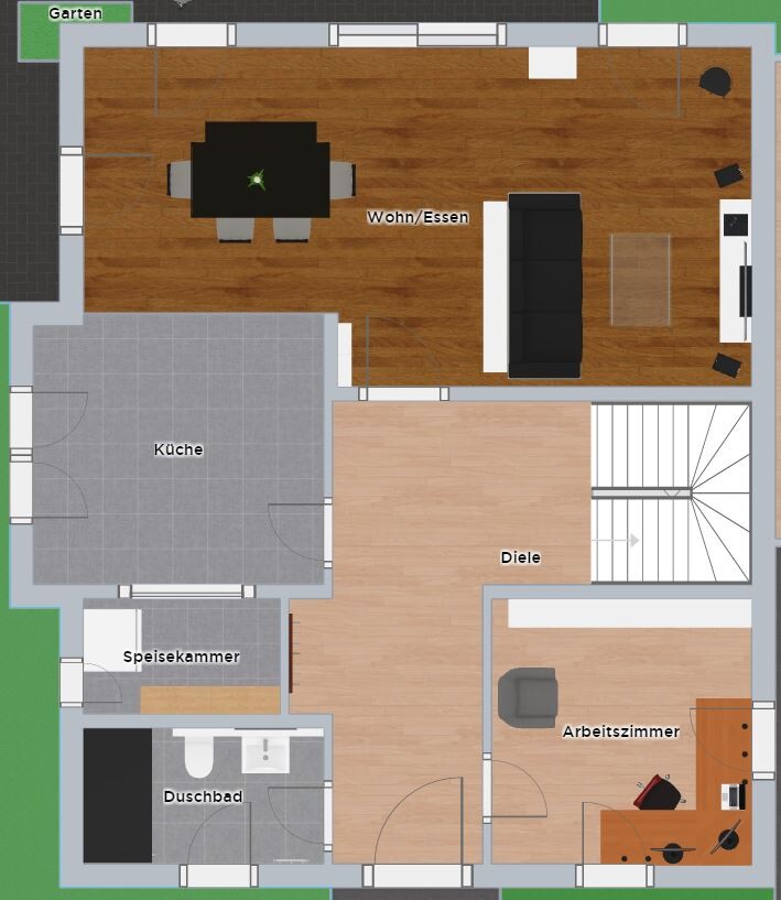 würde ich die Küche da hin setzen, wo du den Wohnbereich geplant hast und den Wohnbereich dorthin, wo der Küchenraum ist. Dann hat man abends im Sommer die Küche an der Grillterrasse und überhaupt wird der Raum großzügiger wirken. Denn jetzt baust du quasi kleine Abschnitte in den großen Raum und wer reinkommt muss erst mal das Sofa umkurven.Vorschlag zur Kenntnis genommen ich merke immer wieder das hier die Idee der Küche direkt an der Terrasse sehr beliebt ist, allerdings kenne ich von niemanden im Freundes- und Familienkreis so, und habe es auch noch nicht vermisst. Und ich muss gestehen, wir nutzen heute den Balkon den wir an der Küche haben schon eher zu selten zum draußen essen, eher um mal später noch draußen zu sitzen und ein Getränk zu genießen. Und so übermäßig weit sind die Wege ja auch nicht.