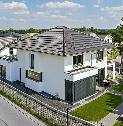 Moderne weisse Hausfassade mit dunklem Ziegeldach, Terrasse und Garten