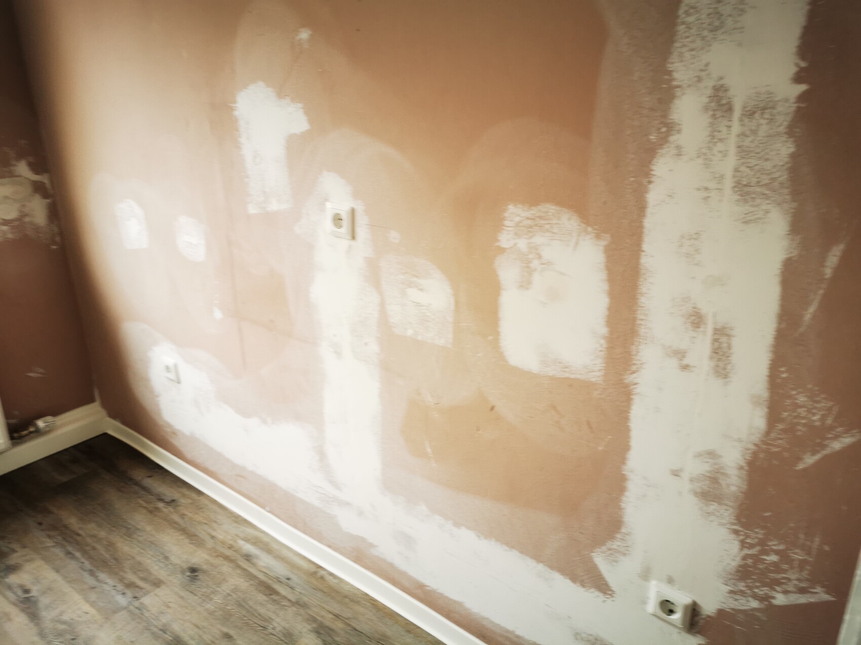Wand mit großflächigen weißen Putzresten, braunem Untergrund, zwei Steckdosen, Holzboden.