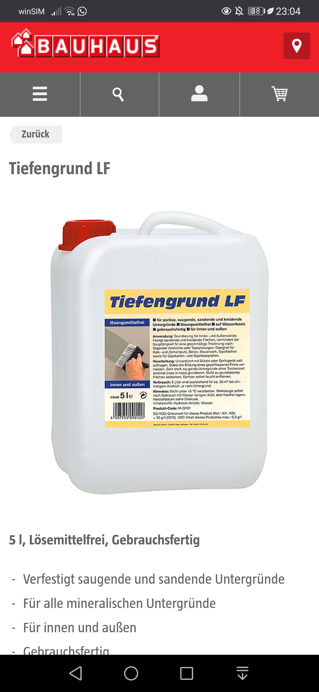 Weiße 5-Liter-Flasche Tiefengrund LF mit rotem Schraubdeckel und Tragegriff