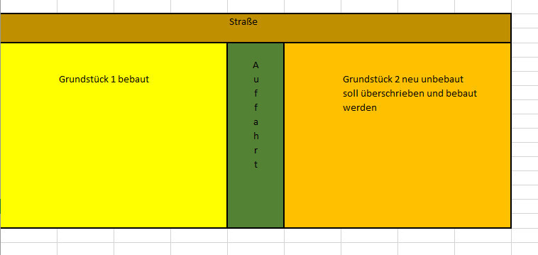 Steht Ihr beide am Ende im GB?Ich habe das mal per Excel dargestellt, wie das bei uns aussieht. Also das gesamte Grundstück ist durch die Auffahrt geteilt und wir würden halt auf dem rechten bauen wollen.