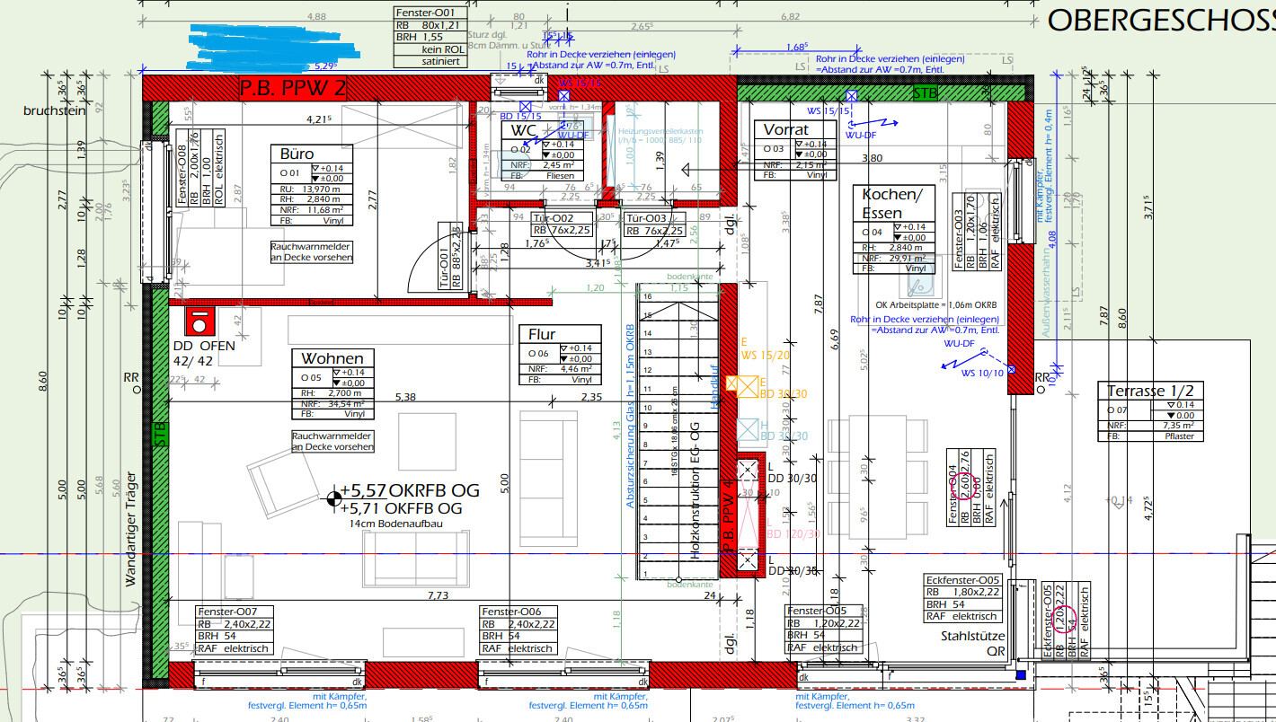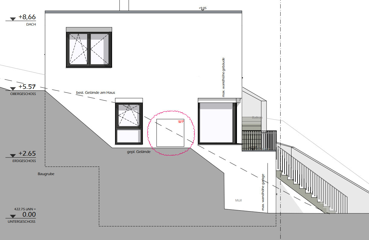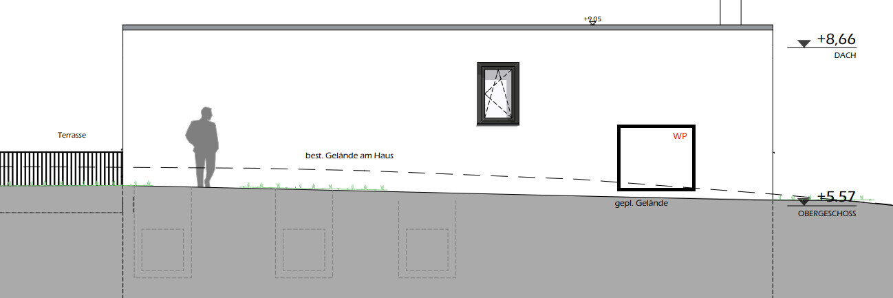 Die Leitung der Wärmepumpe wurde bereits vom UG zum Schlafzimmer nach außen geführt, dieser Bereich ist auch schon verfüllt. Andere Standorte sind daher und generell auch wegen des sehr steilen Geländes eher schwierig. Die Frage ist jetzt ob die Leitung noch verlängert wird und die Wärmepumpe nach oben gestellt wird oder ob sie dort verbleibt wo aktuell die Leitung in etwa endet (zwischen Schlafzimmer und Kinderzimmer). Beim Lesen der Pläne beachten, dass unser Wohngeschoss inkl. Terrasse und Garten im OG sind.