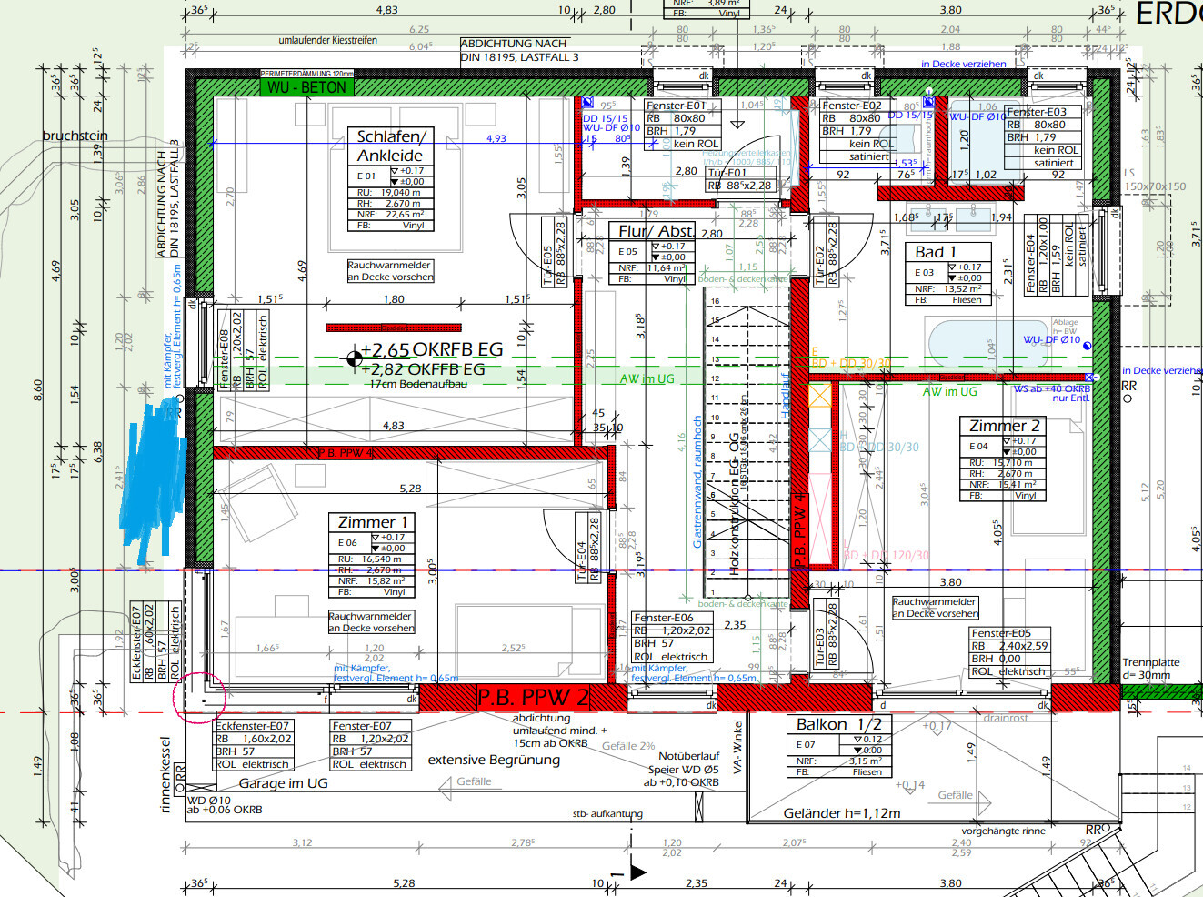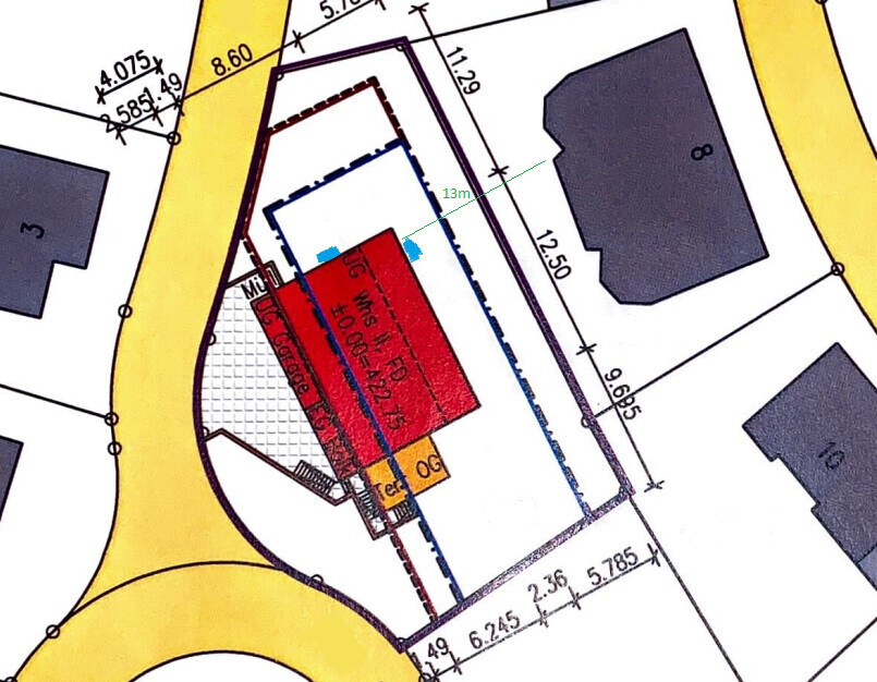 Danke für die zahlreichen Meinungen, das hilft schon sehr. Gerne noch einige Pläne zum veranschaulichen, die beiden potentiellen Wärmepumpe Standplätze sind blau eingezeichnet. Der Abstand zum Gebäude des Nachbar beträgt etwa 13m (hatte ich zuvor schlecht überschlagen), der Abstand zur Grundstücksgrenze fast 6m. Ich möchte den Nachbarn natürlich auch nicht mit Geräuschen belästigen, aber ich glaube durch den Abstand kommt da nichts mehr an, zumal dort auch noch Mauern kommen die den Schall z.T. abhalten würden.