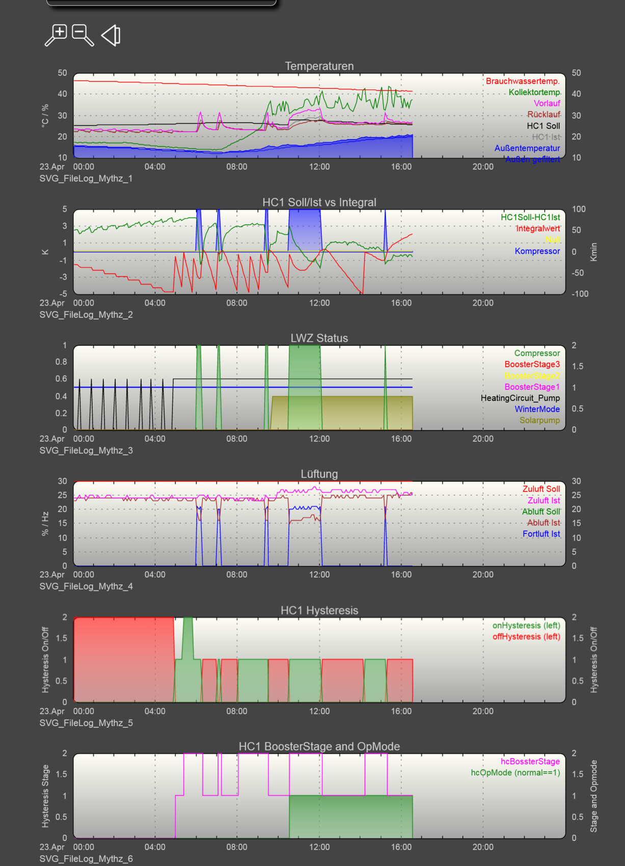 Gestern (hier hatte ich abends die Lüftung für eine kurze Zeit deaktiviert, daher die "Pause" im 4. Diagramm):