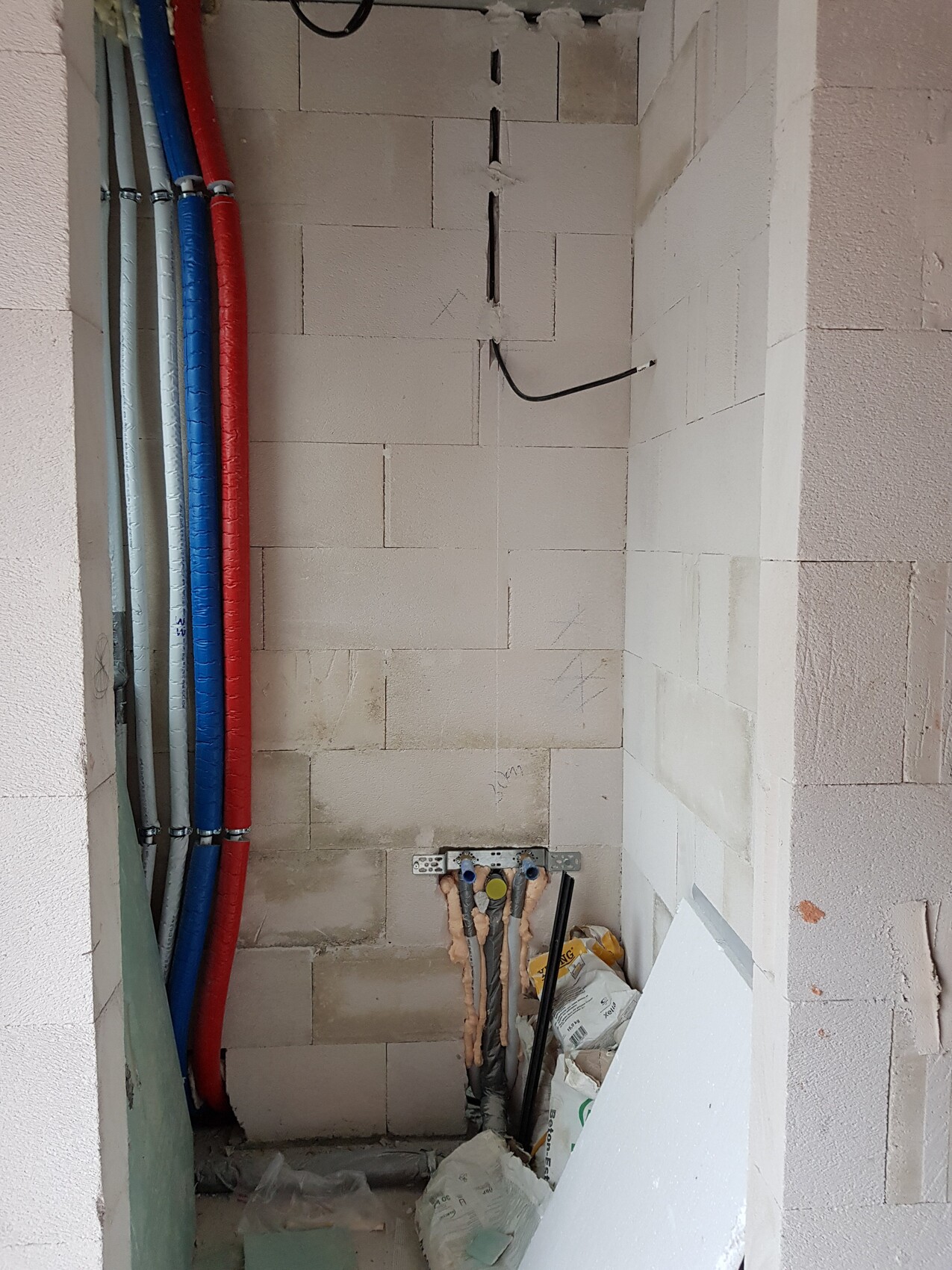 Installationsraum mit farbigen Wasserleitungen (rot/blau) an der Wand.
