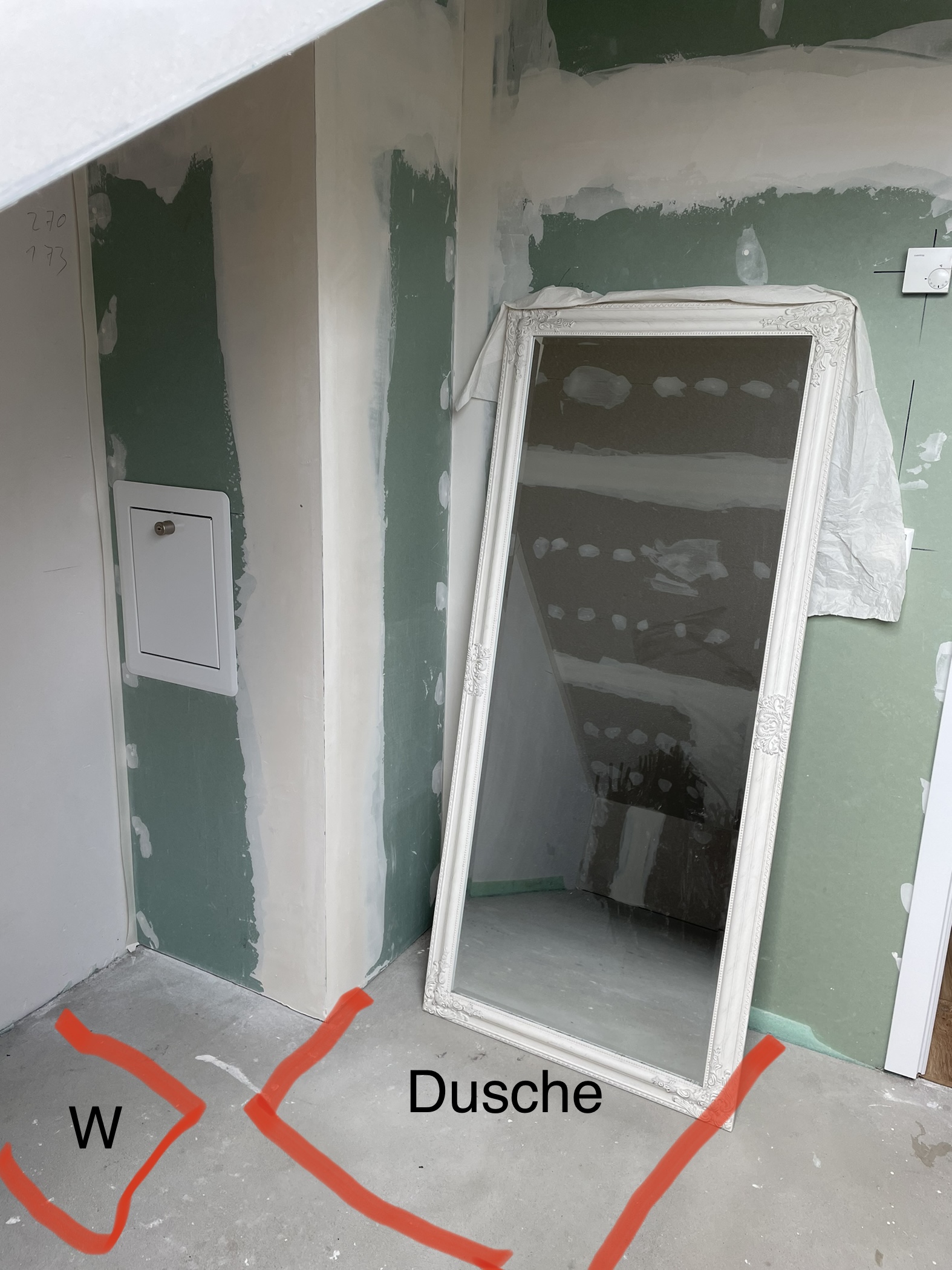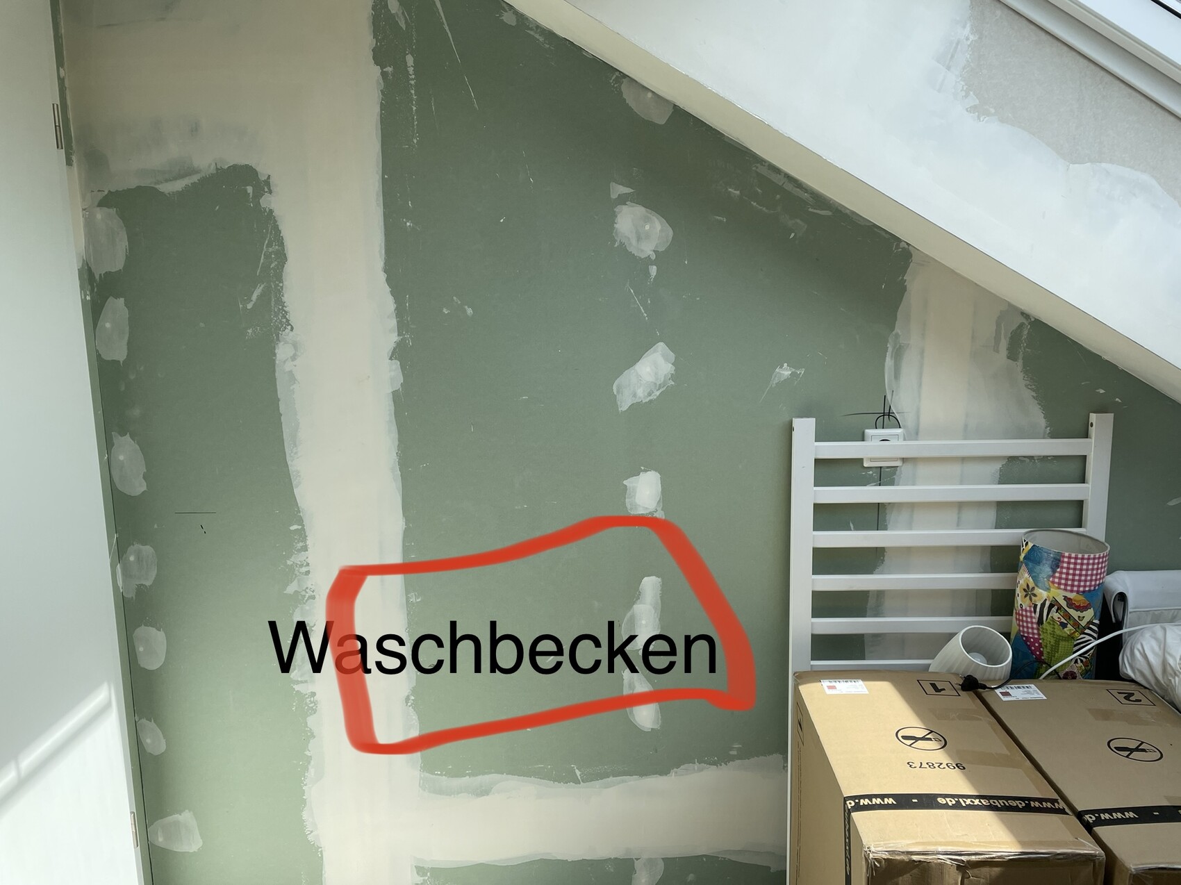 Hallo ihr Lieben, hier ein paar Fotos vom Raum. Ich habe mal grob markiert, wie die jetzige Planung aussieht. Ich hoffe ihr könnt was mit den Bildern anfangen. Am schönsten wäre es halt gewesen, wenn die Dusche dahin könnte, wo wir jetzt das wc eingezeichnet haben, aber dann wäre der Schacht halt in der Dusche. Die Abkasterung müsste geöffnet und neu verkleidet werden, weil dort die Wasserleitung gelegt wurde.