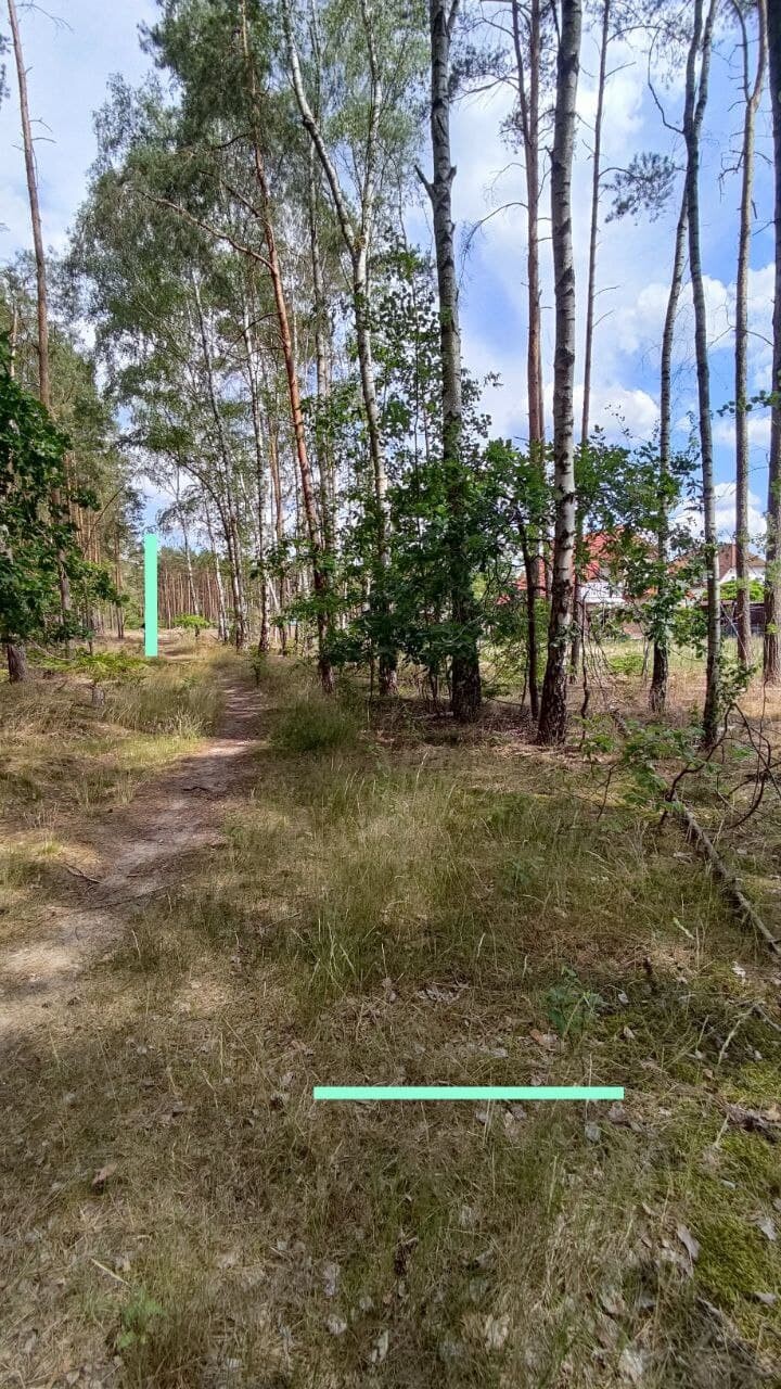 Waldweg zwischen Birken; grasiger Boden, türkisfarbene Markierungen im Gelände.