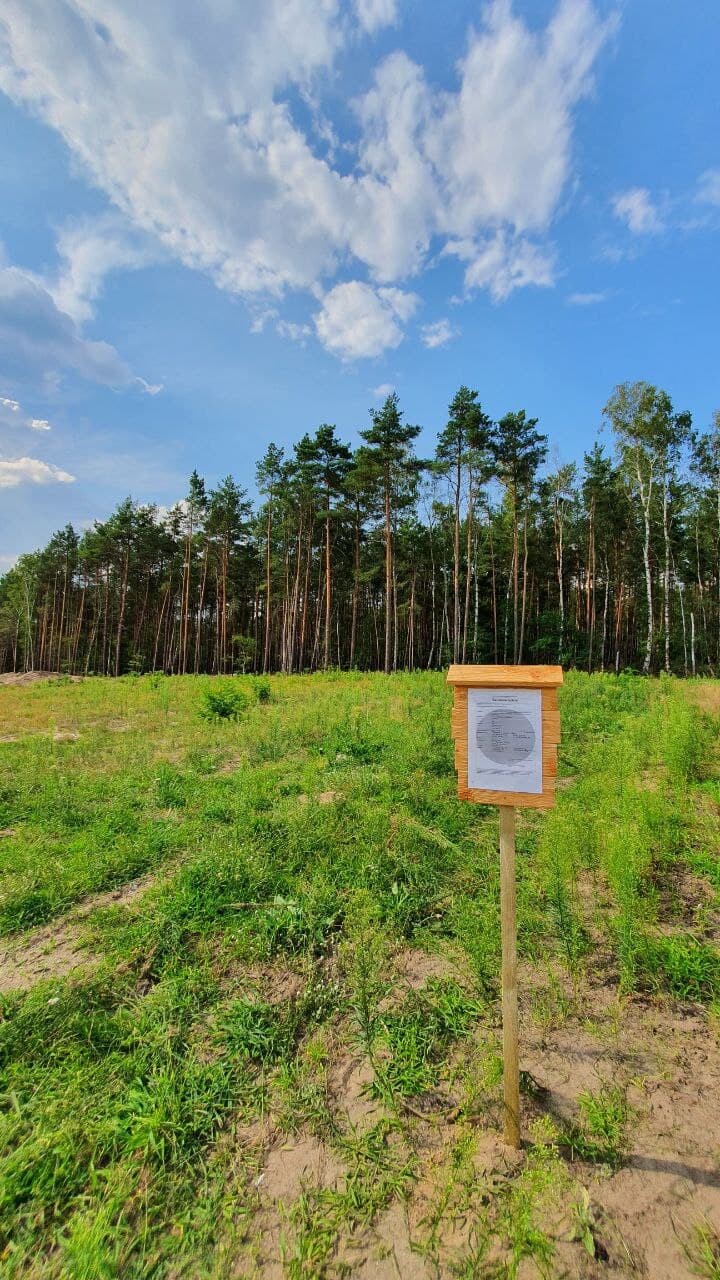 Grünes Feld mit Gras, Holz-Infotafel vor Wald aus Kiefern, blauer Himmel.