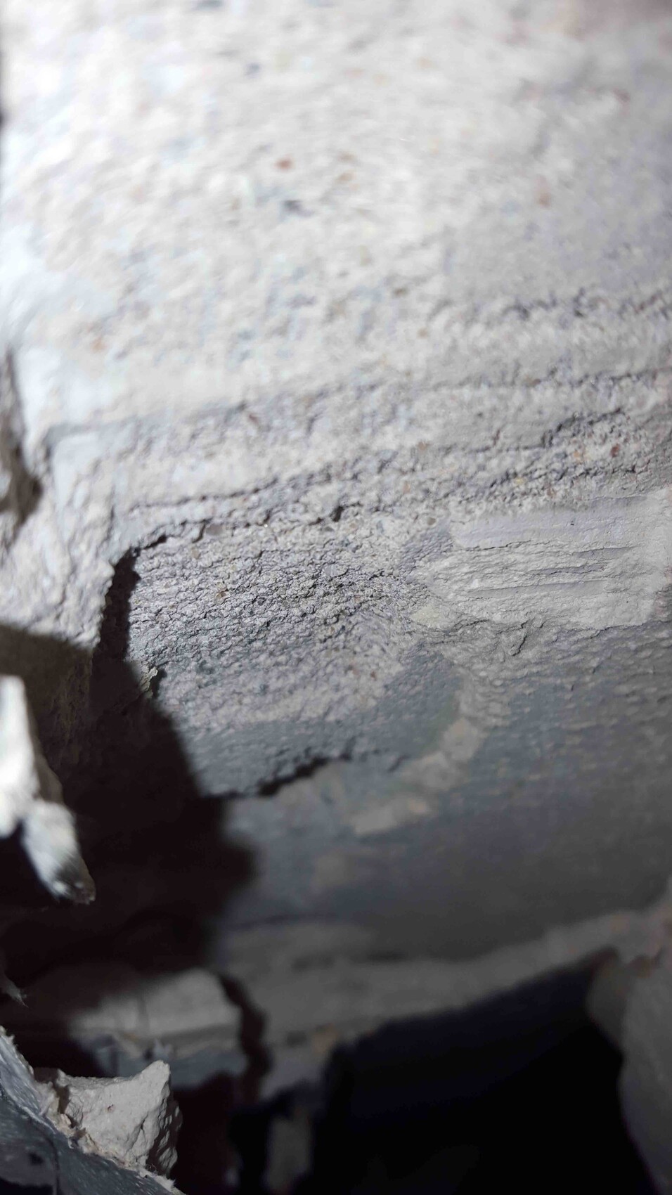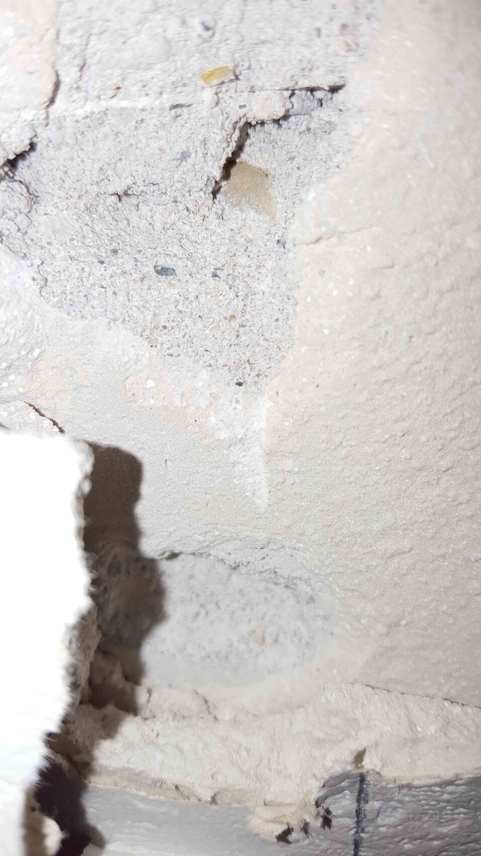 Nahaufnahme einer rauen Betonwand mit bröckeligem Putz, Rissen und Staub auf einer Baustelle.