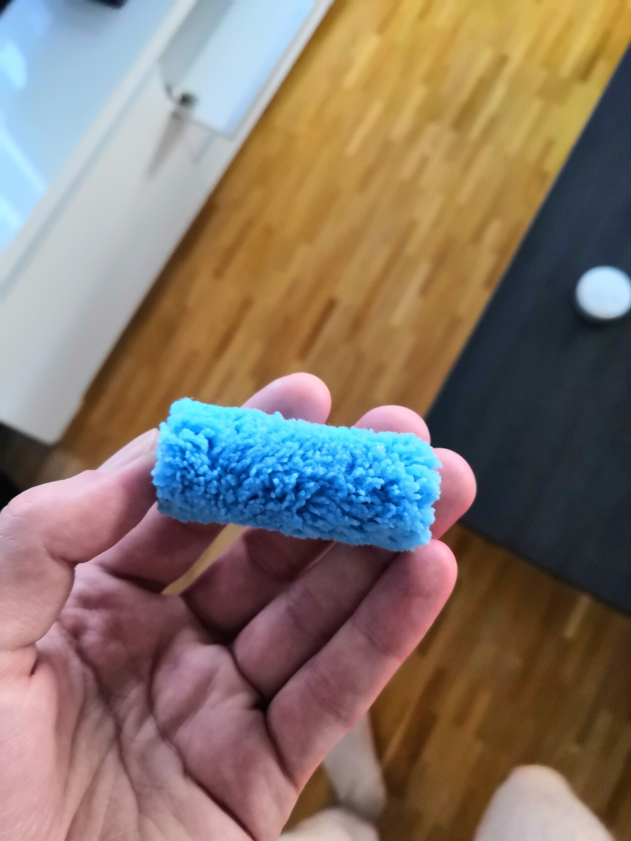 Hand hält einen kleinen blauen, flauschigen Pinselroller aus Schaumstoff.