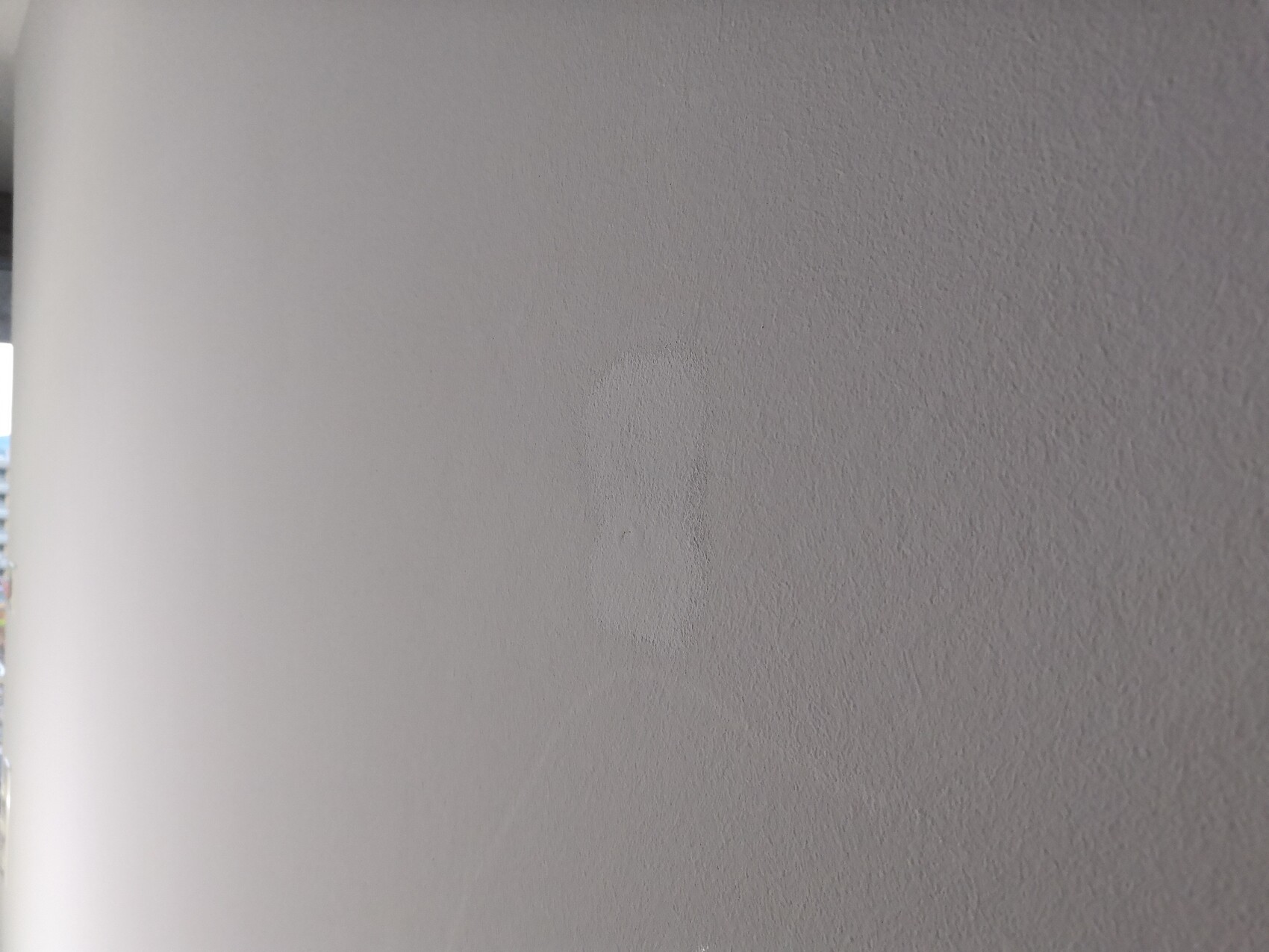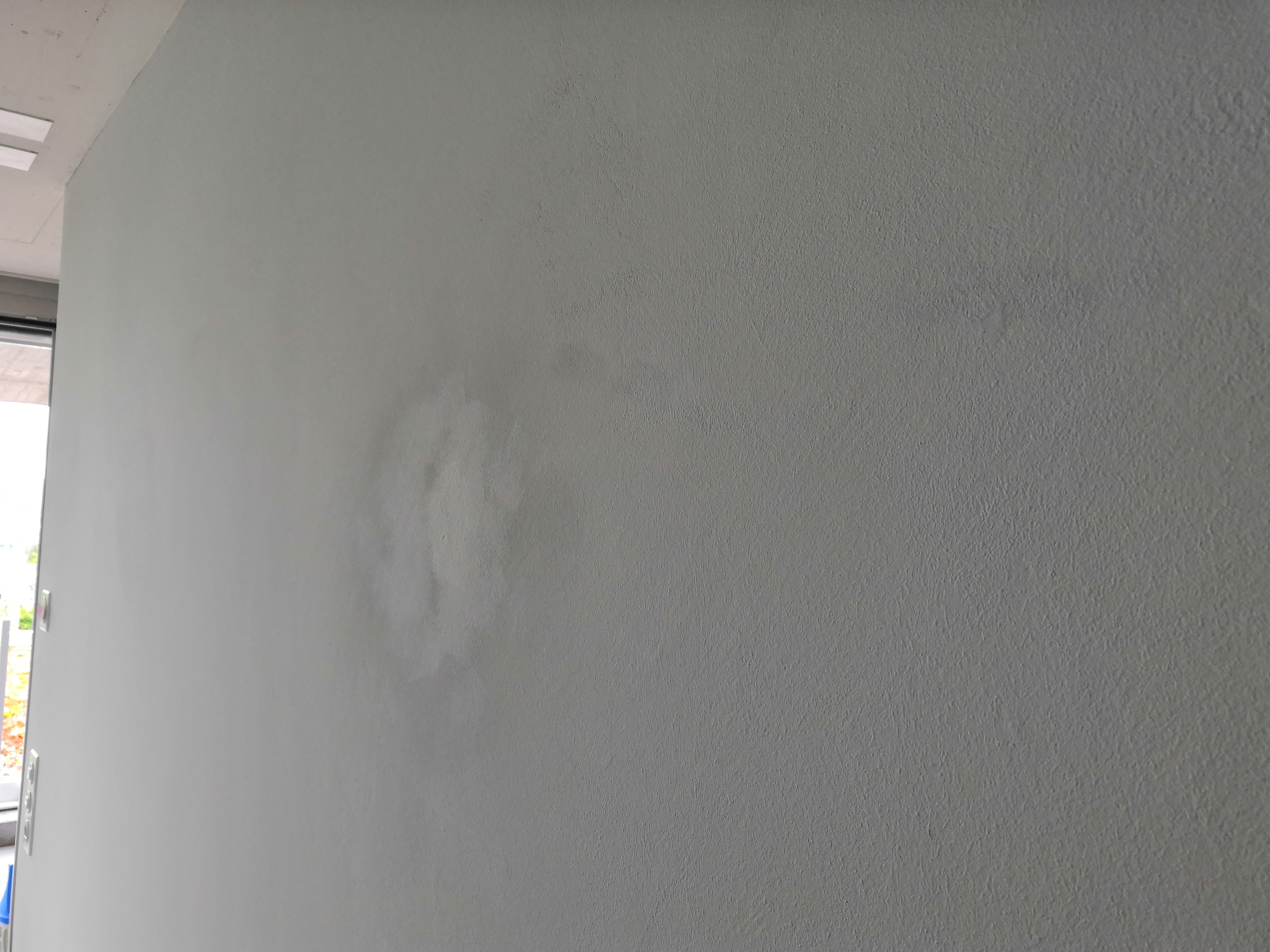 Grau verputzte Innenwand mit dunklem Fleck und Farbverlauf; linkes Fenster sichtbar.