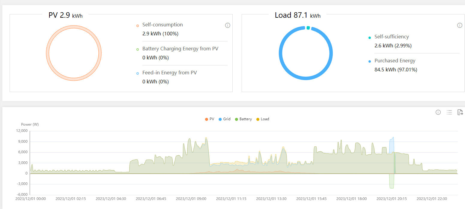 PV 2.9 kWh, Last 87.1 kWh; Selbstversorgung 2.6 kWh, gekaufte 84.5 kWh